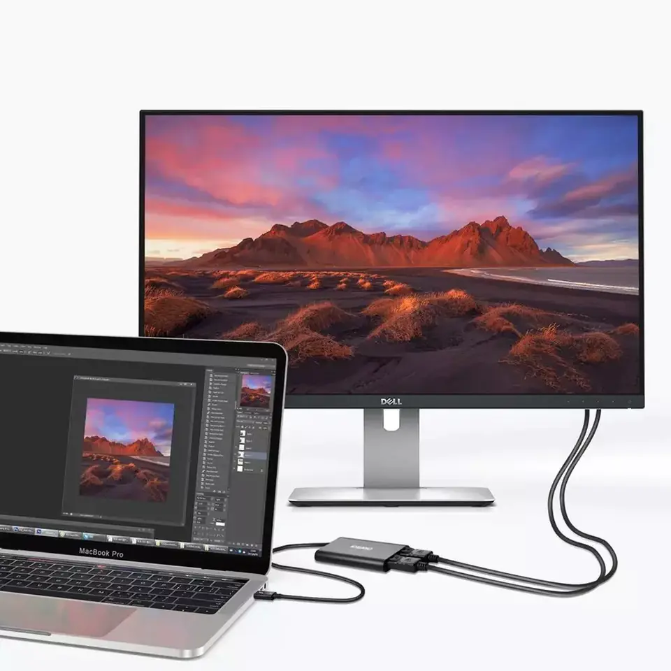 - Praktyczny adapter z wtyczką USB Typ C i dwoma złączami Display Port. Doskonałe akcesorium dla osób, które potrzebują połączyć komputer z monitorem przez wtyczkę DP.