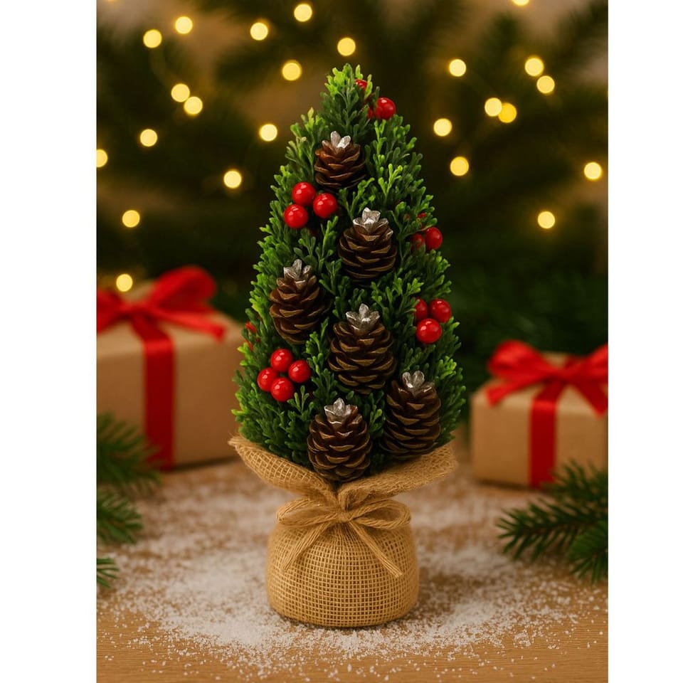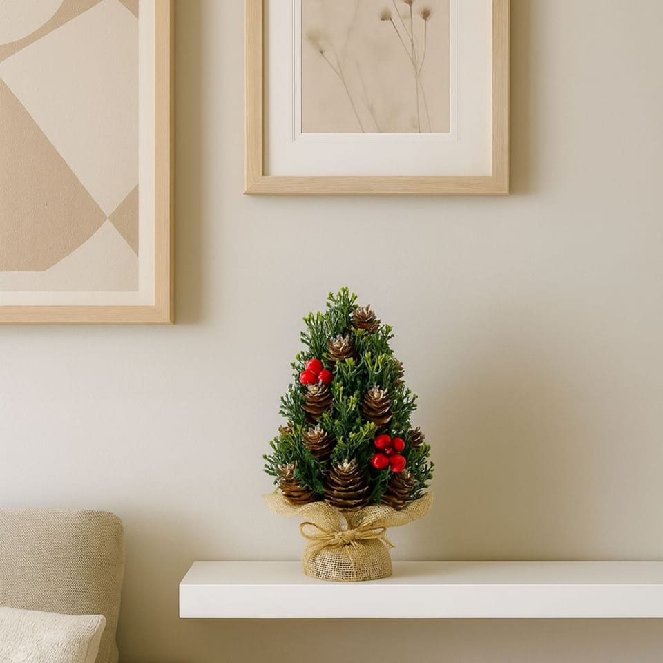 Mini choinka świąteczna to urocza dekoracja, która doskonale wprowadza świąteczny klimat do każdego wnętrza. Została wykonana z dbałością o szczegóły – gęste, zielone gałązki ozdobione są błyszczącymi szyszkami oraz czerwoną jarzębiną, która nadaje całości eleganckiego i naturalnego wyglądu. To idealna propozycja na biurko, komodę, stół, ladę sklepową czy jako element dekoracji świątecznej w salonie, kuchni lub biurze.