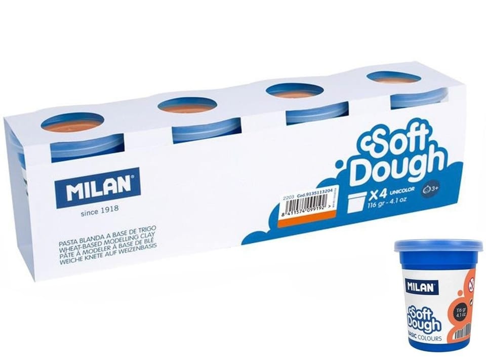Miękka masa plastyczna. Spójna i elastyczna, łatwa do formowania. Nowe kolory można tworzyć łącząc dwa lub więcej kolorów. Nie pozostawia resztek na rękach. Opakowanie zawiera 4 kubeczki w kolorze białym o pojemności 116 g każdy z przezroczystymi pokrywkami. Naturalny skład, bezpieczny dla dzieci. Tylko składniki pochodzenia roślinnego: mąka pszenna, sól, barwnik spożywczy. Zawiera gluten.