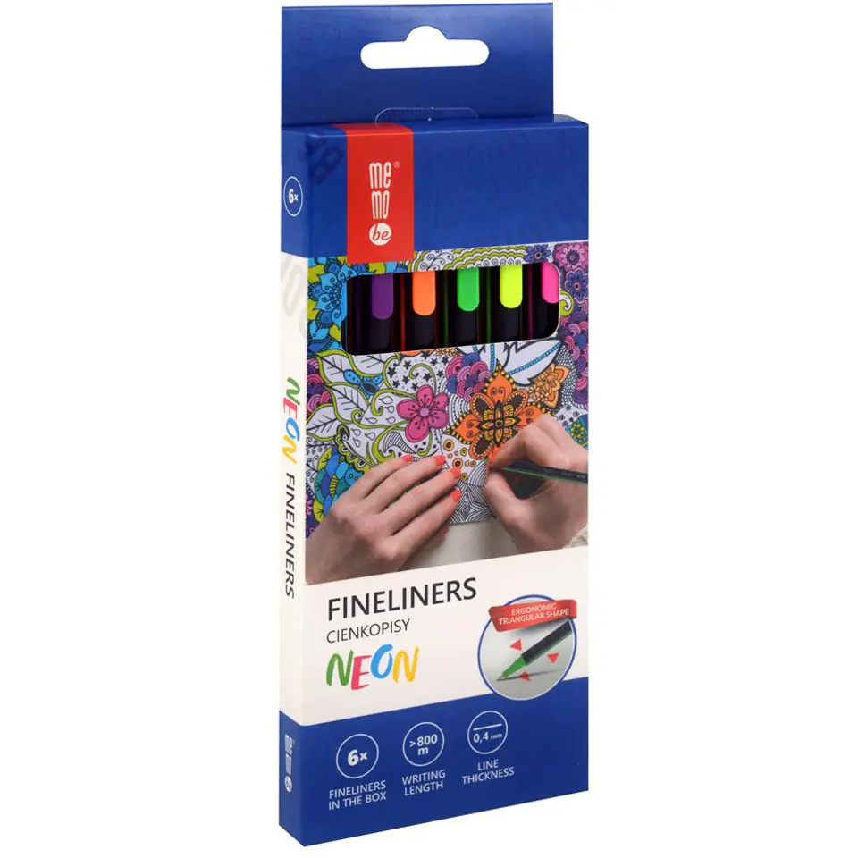 Zestaw cienkopisów MemoBe w 6 kolorach neonowych w kartonowym pudełku z eurozawieszką. Cienkopisy z końcówką F o rozmiarze 0,4mm. Obudowa w trójkątnym kształcie ułatwiającym utrzymanie prawidłowego i wygodnego chwytu. Miękka, płynna linia pisania o długości powyżej 800m. W opakowaniu kolory neonowe: żółty, różowy, niebieski, zielony, pomarańczowy i fioletowy.