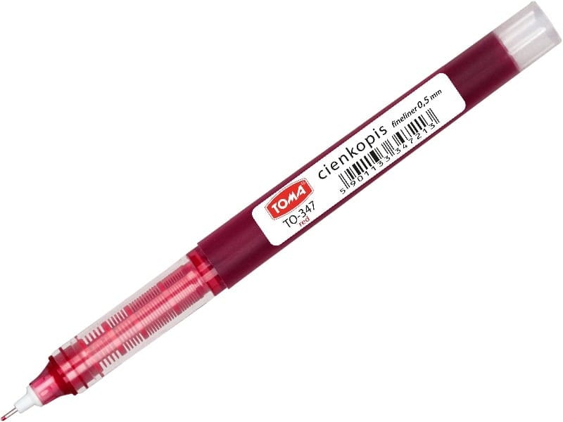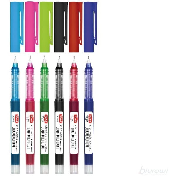 Cienkopisy kapilarne 0,5mm 6 kolorów TO-347 TOMA Cienkopis kapilarny z fibrową końcówką w średnicy 0,5 mm. Dzięki przeźroczystej obudowie umożliwia nam kontrolowanie stanu tuszu. Polipropylenowa obudowa i końcówka w wentylowaną nasadką z klipem w kolorze tuszu. Produkt wyposażony w system zabezpieczający "cap in cap", który chroni końcówkę cienkopisu przed wyschnięciem. Cienkopis posiada spieralny tusz oraz metalowe wsparcie dla końcówki, które poprawia stabilność podczas pisania oraz pozwala na niebrudzące kreślenie przy linijce. Produkt dostępny w 8 wariantach kolorystycznych.