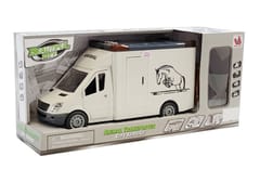Idealnie odwzorowany pojazd transporter do przewozu koni. Auto dopracowane w każdym szczególe, wnętrze wyposażone jest we wszystkie elementy prawdziwego pojazdu takie jak kierownica, deska rozdzielcza, siedzenia. Pojazd posiada dźwięki oraz efekty świetlne, włączane przyciskami umieszczonymi na dachu pojazdu. Auto posiada napęd typu power friction. W pojeździe otwierają się drzwi boczne i tylne oraz posiada zdejmowany dach. Dodatkowo w zestawie figurka konika. Autko jest lekkie i ładnie wykonane, zasilane bateriami, które dołączono do zestawu. Pojazd posiada gumowe koła.
