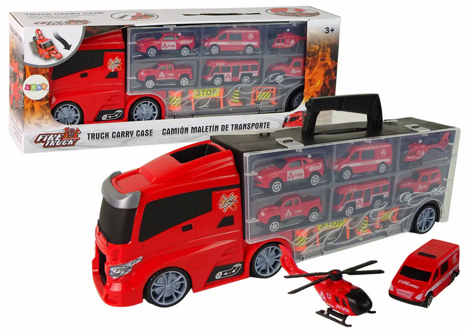 Transporter ciężarówka strażacka to wielofunkcyjny pojazd, który inspiruje dzieci do zabawy w akcje ratunkowe w ramach własnych, bohaterskich przygód. Transporter ma w przyczepie 6 pojazdów oraz po drugiej stornie może pomieścić kolejne 6 samochodzików (sprzedawanych oddzielnie).