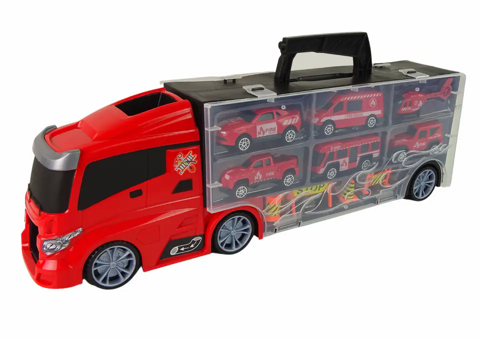Transporter ciężarówka strażacka to inspirowana pracą strażaków ciężarówka z miejscem do przechowywania pojazdów, zachęcająca do wymyślania własnych przygód. W naczepie po przeciwnej stornie jest specjalny schowek, w którym można przechowywać dodatkowe pojazd oraz akcesoria, co pozwala na trzymanie wszystkich elementów w jednym miejscu, a to nie musisz się martwić, że coś zgubisz, 6 pojazdów związanych z gaszeniem „pożarów” inspiruje do kreatywnej zabawy w realistycznym otoczeniu.