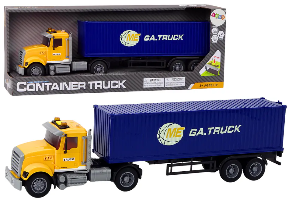Żółty tir z granatową naczepą wyróżnia się efektami świetlnymi i dźwiękowymi, które dodają realizmu i sprawiają, że zabawa staje się jeszcze bardziej emocjonująca. Dźwięk silnika, klakson oraz odgłos cofania sprawiają, że dziecko może poczuć się jak prawdziwy kierowca dużej ciężarówki.