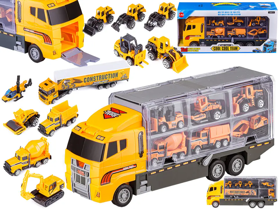 Zabawka ta z pewnością wywoła uśmiech na twarzy każdego chłopca i zapewni mu wiele godzin wspaniałej zabawy.Wielofunkcyjna ciężarówka będzie świetnym prezentem dla małego fana motoryzacji. Konstrukcja tego pojazdu oraz dołączone do zestawu pojazdy budowlane sprawiają, że można je wykorzystać w zabawie na wiele różnych sposobów. Ciężarówka może pełnić funkcję garażu, lawety, transportera lub wyrzutni.