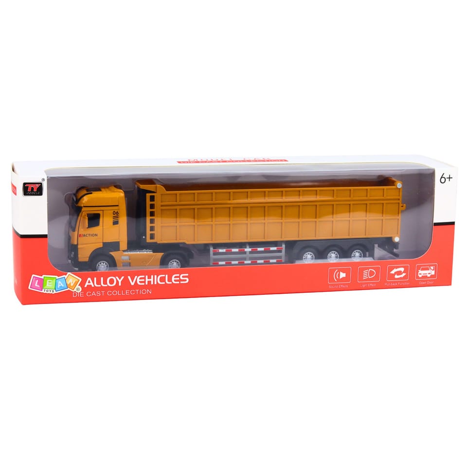 Pojazd wyposażony jest w napęd na naciąganie, który pozwala na dynamiczną zabawę bez potrzeby używania pilota czy baterii do jazdy. Wystarczy delikatnie cofnąć samochód i puścić, aby ruszył do przodu. Dodatkową atrakcją są efekty świetlne i dźwiękowe, które zwiększają realizm zabawy i angażują dziecko na dłużej. Podnoszona naczepa z funkcją wywrotki umożliwia symulację prawdziwych prac transportowych, a ruchome elementy pozwalają na łatwy załadunek i rozładunek.