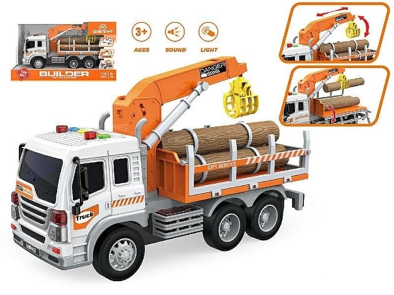 auto ciężarowe 1:16, z ładowarką do drzewa, światło, dźwięk; 26x14x10cm, W/B