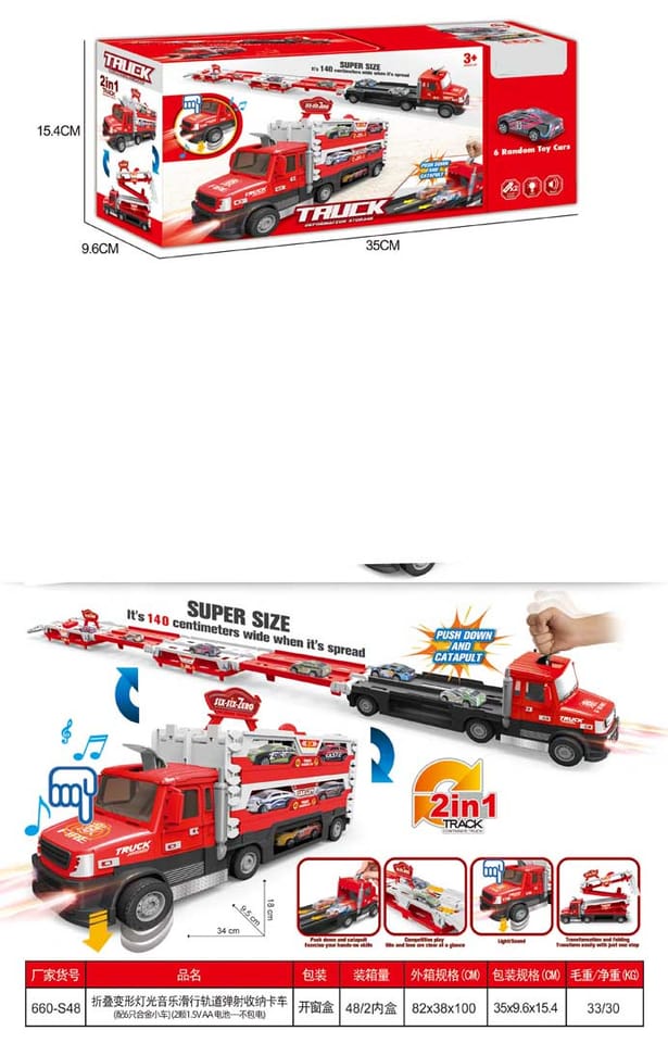 | Wymiary | - truck ok. 34 cm x 9,5 cm x 18 cm,- truck po rozłożeniu ok. 140 cm długości,- średnica koła ok. 3 cm,- autko ok. 6,5 cm x 3 cm x 2,5 cm,- opakowanie ok. 35 cm x 9,5 cm x 15,5 cm. |