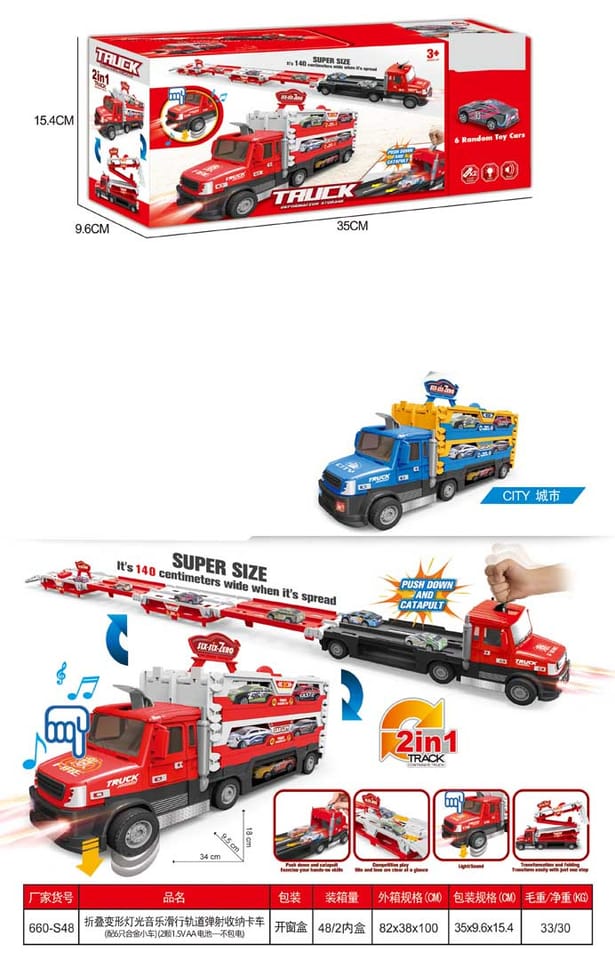 | Wymiary | - truck ok. 34 cm x 9,5 cm x 18 cm,- truck po rozłożeniu ok. 140 cm długości,- średnica koła ok. 3 cm,- autko ok. 6,5 cm x 3 cm x 2,5 cm,- opakowanie ok. 35 cm x 9,5 cm x 15,5 cm. |