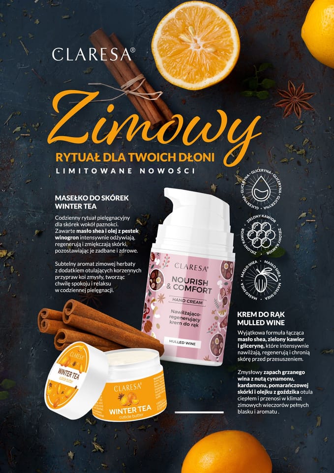 Krem MULLED WINE to wyjątkowa formuła łącząca masło shea, zielony kawior i glicerynę, które intensywnie nawilżają, regenerują i chronią skórę przed przesuszenie. Bogata konsystencja szybko się wchłania, pozostawiając dłonie jedwabiście gładkie, miękkie i przyjemne w dotyku. Zmysłowy zapach grzanego wina z nutą cynamonu, kardamonu, pomarańczowej skórki i olejku z goździka otula ciepłem i przenosi w klimat zimowych wieczorów pełnych blasku i aromatu przypraw. To pielęgnacyjny rytuał, który koi skórę i zmysły – idealny na chłodne dni.