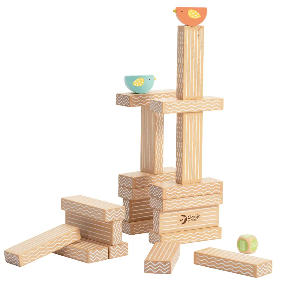 Drewniana gra edukacyjna od marki CLASSIC WORLD pozwala bawić się maluchom w wiele wyjątkowych gier - tylko wyobraźnia jest ograniczeniem! Gra składa się z 20 prostokątnych klocków, 2 figurek ptaków oraz kostki do gry, wszystkie wykonane z drewna bukowego. Zabawkę można wykorzystać do różnych gier i zabaw. Jedną z najbardziej popularnych jest Zabawa w krzywą wierzę - to popularna gra zręcznościowa, polegająca na wyciąganiu drewnianych klocków z wieży i układaniu ich na jej szczycie, bez spowodowania zawalenia konstrukcji.