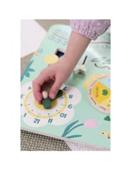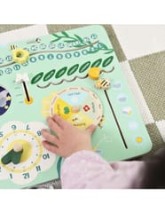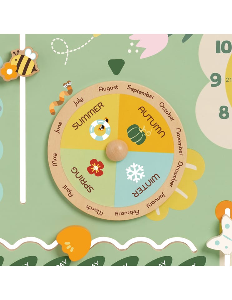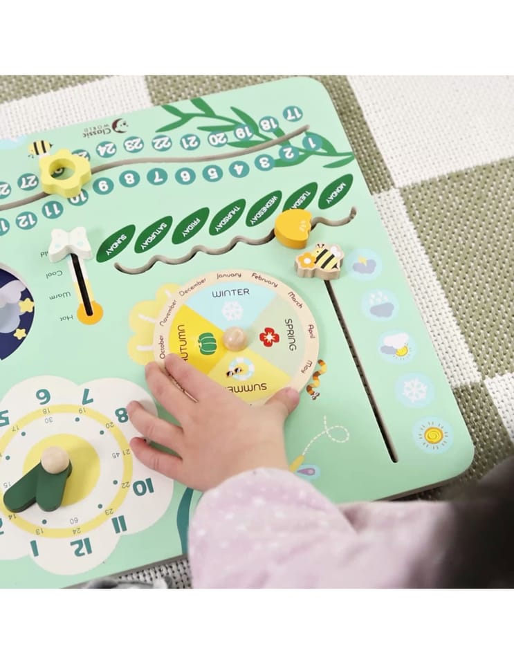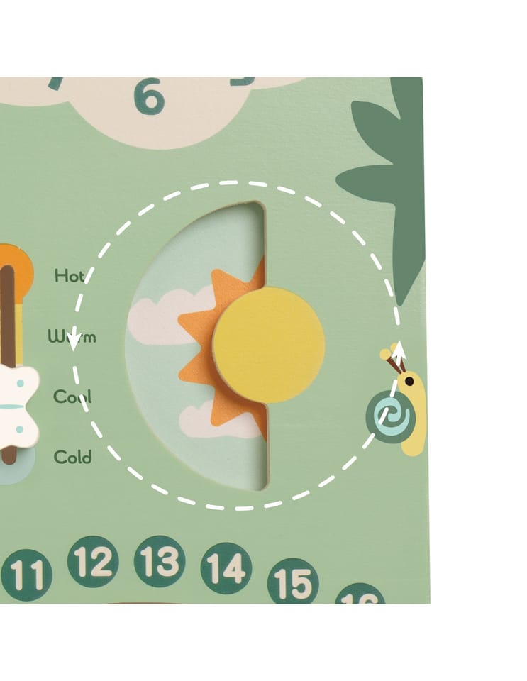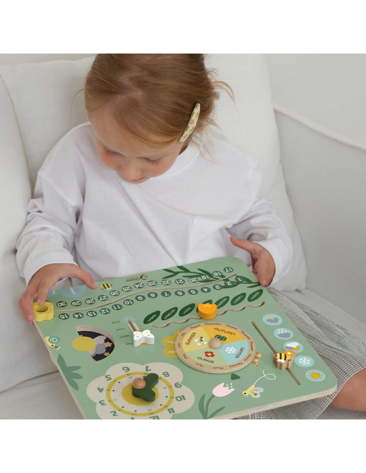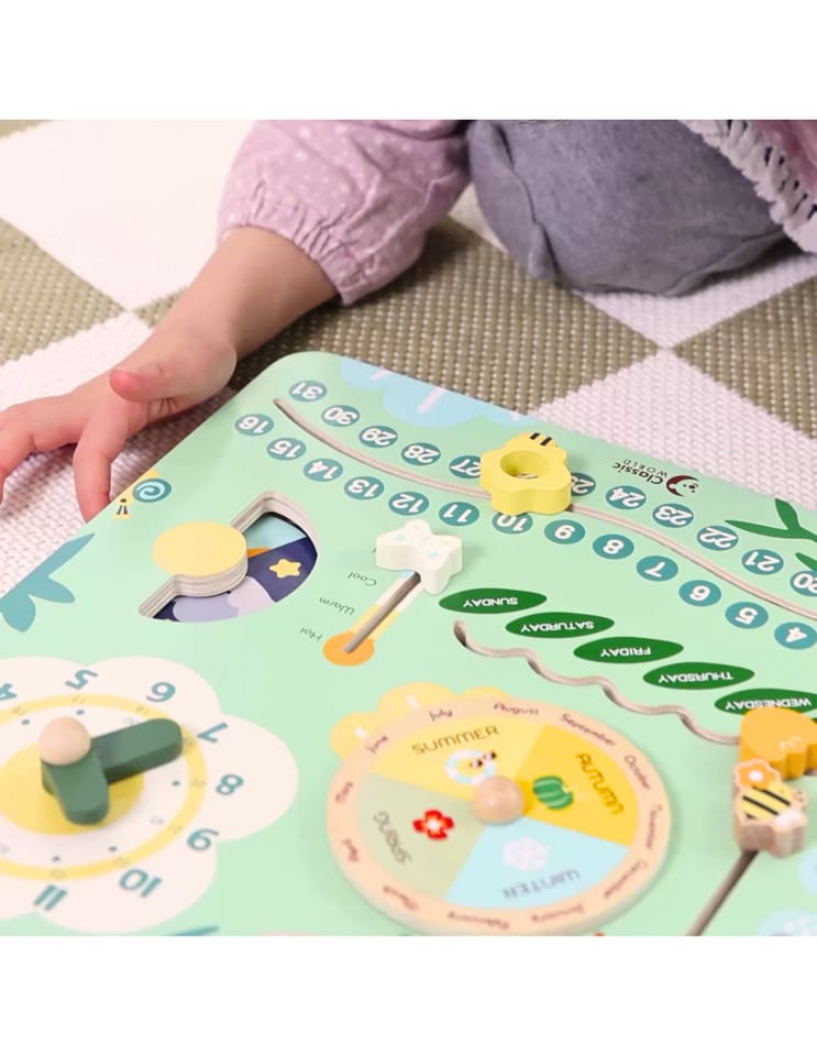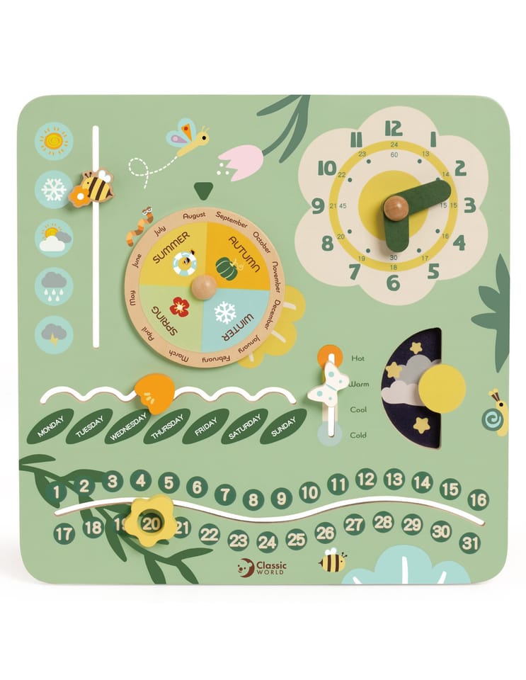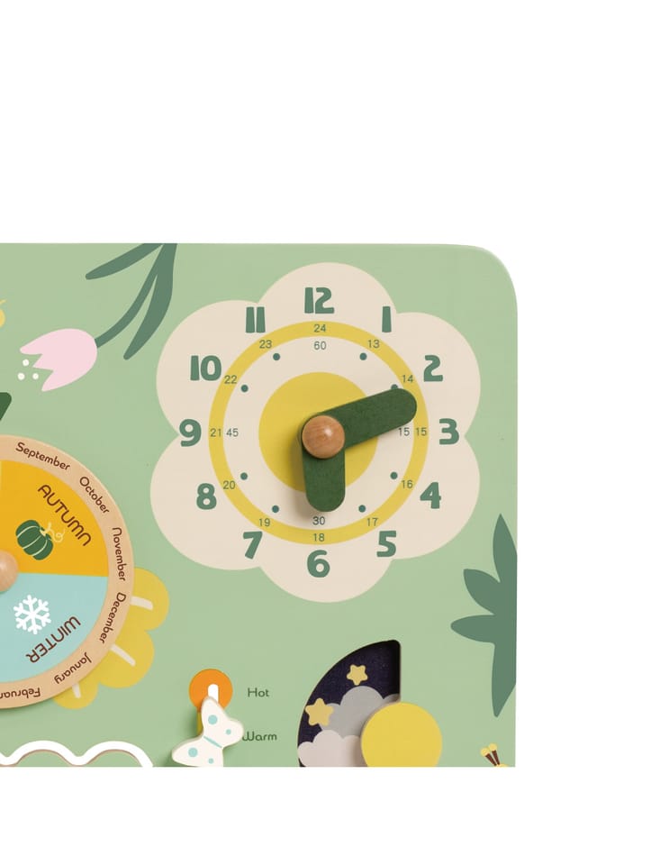 Drewniana tablica rozwija zdolności manualne, koncentrację i cierpliwość - dziecko uczy się odczytywania godzin, dni tygodnia, dat i pór roku. Może także poznawać zmieniającą się pogodę i temperaturę.
