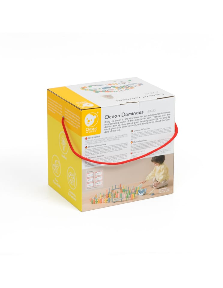 Drewniane Domino Ocean od marki Classic World to niezwykły zestaw, który przeniesie Twoje dziecko w fascynujący świat morskich głębin. Ten kolorowy komplet składa się ze 100 elementów, które pozwalają na ułożenie efektownego toru przeszkód z klocków. Zabawka wyróżnia się pięknym wzornictwem – została zaprojektowana w Paryżu, co widać w dbałości o detale i doborze pastelowej kolorystyki. W zestawie znajdują się nie tylko klasyczne kostki domina, ale także urocze figurki zwierząt morskich, takich jak wieloryb, pingwin czy konik morski, oraz elementy konstrukcyjne urozmaicające zabawę, jak schodki czy mostki. Produkt wykonany jest z najwyższej jakości naturalnego drewna, co potwierdza certyfikat FSC. Oznacza to, że materiał pochodzi z odpowiedzialnie zarządzanych źródeł. Zabawa tym zestawem to nie tylko radość z przewracania kostek, ale przede wszystkim doskonały trening umiejętności. Dziecko uczy się cierpliwości, precyzji oraz poznaje zasadę przyczyny i skutku. To idealny pomysł na prezent, który łączy tradycyjną zabawę z nowoczesną edukacją ekologiczną.