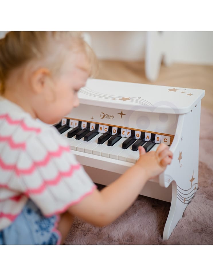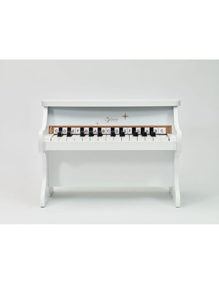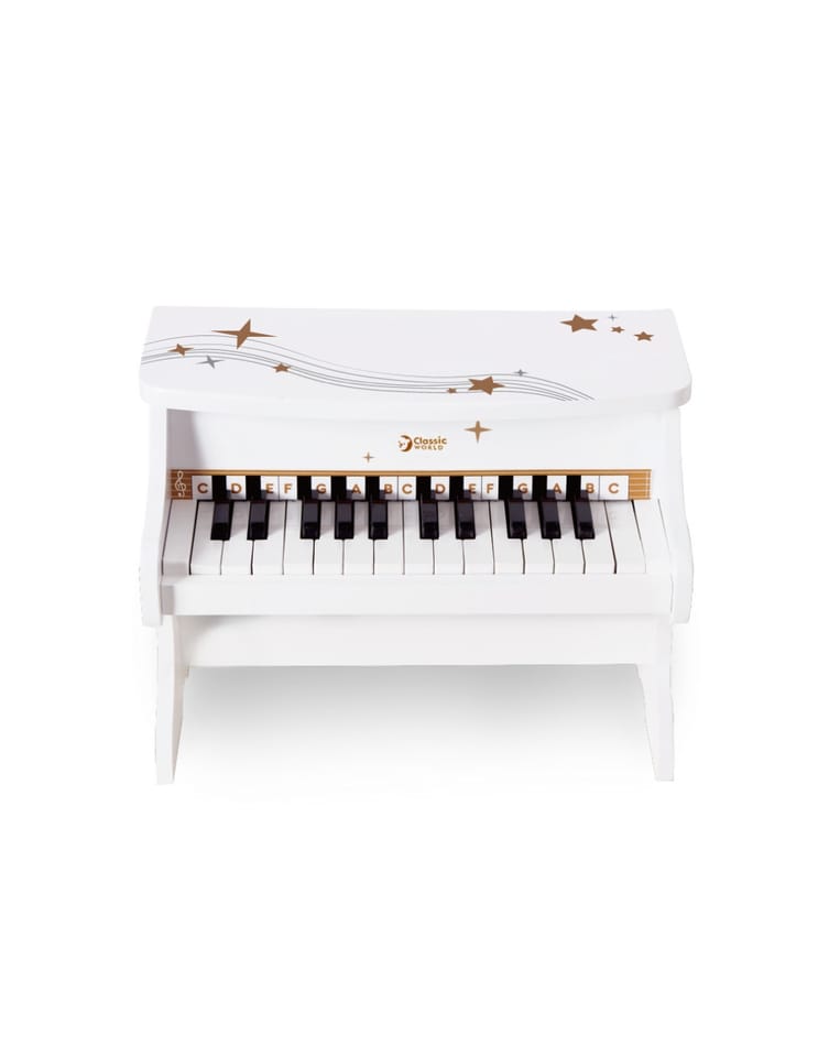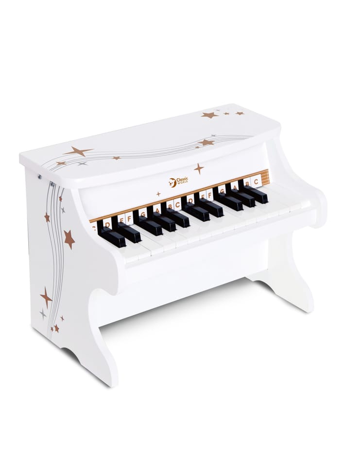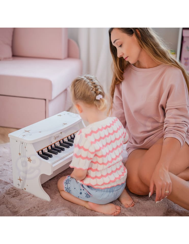 Wyjątkowe Drewniane Pianinko Fantasy od renomowanej marki CLASSIC WORLD to idealny wybór na pierwszy instrument dla Twojego dziecka. Ten elegancki, biały instrument wykonany z naturalnego drewna został zaprojektowany tak, aby wprowadzić maluchy w magiczny świat muzyki w sposób radosny i kreatywny. Pianinko posiada 25 klawiszy, które wydają czyste i miłe dla ucha tony, pozwalając dziecku na tworzenie własnych melodii. Solidna, ręcznie wykonana konstrukcja oraz oryginalny design ozdobiony złotymi gwiazdkami sprawiają, że zabawka nie tylko bawi, ale również stanowi piękną ozdobę dziecięcego pokoju. Lekkie uderzanie w klawisze pomaga dziecku odkrywać zależności przyczynowo-skutkowe oraz buduje pewność siebie poprzez samodzielne występy artystyczne.
