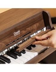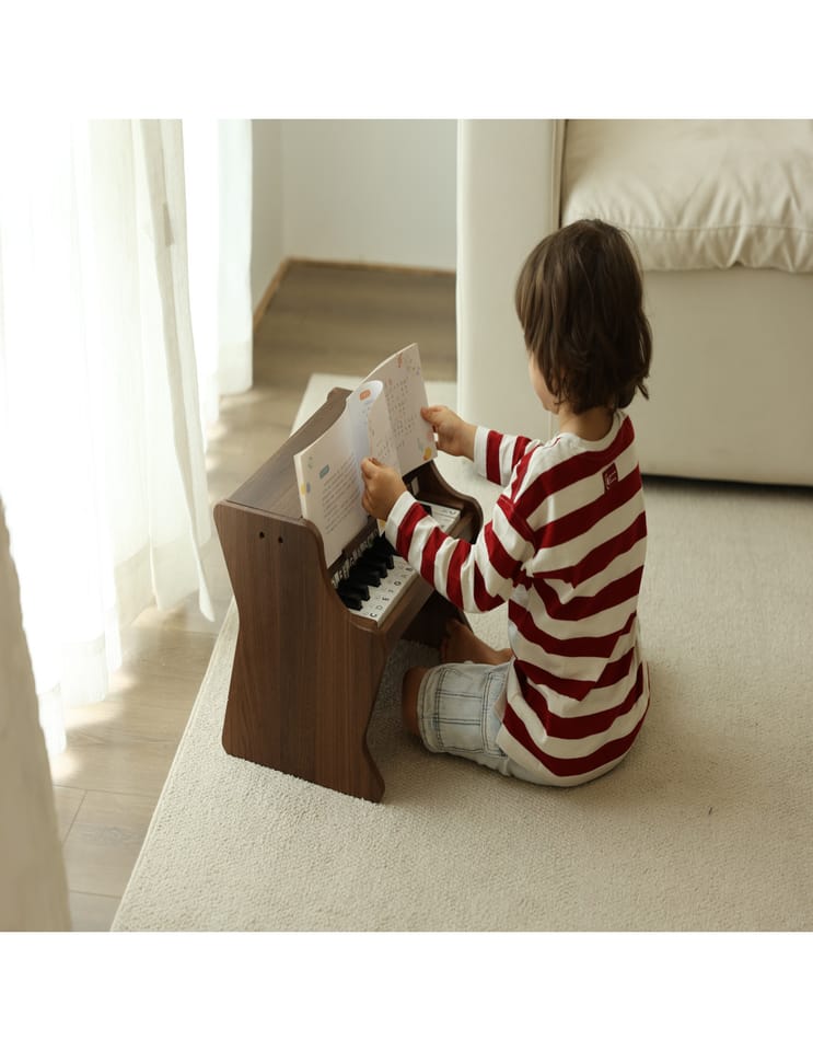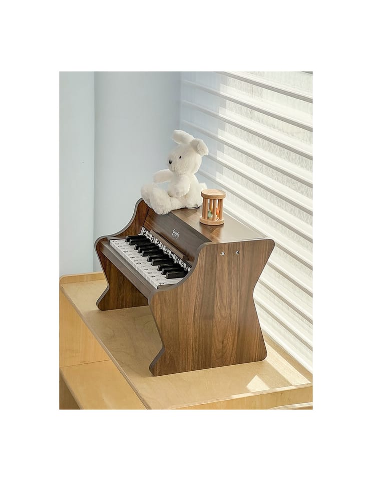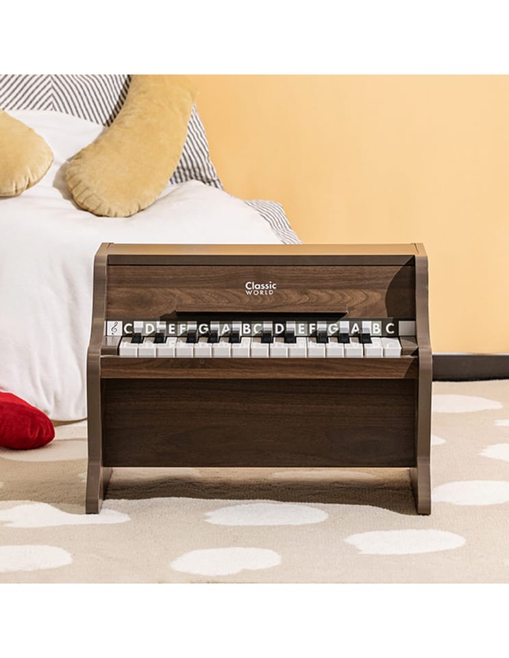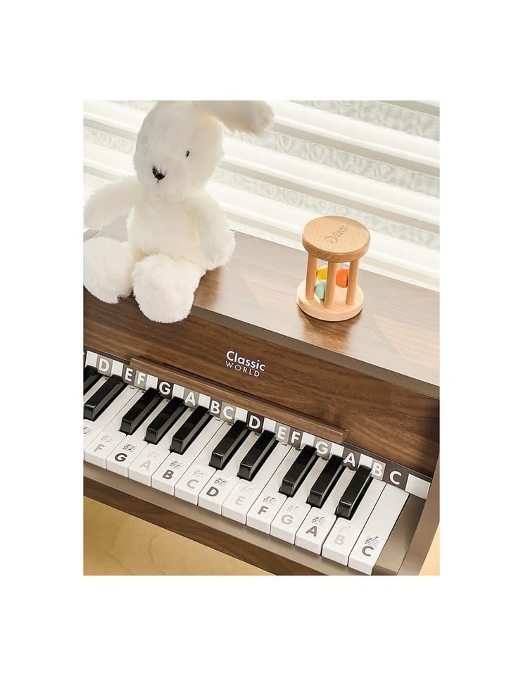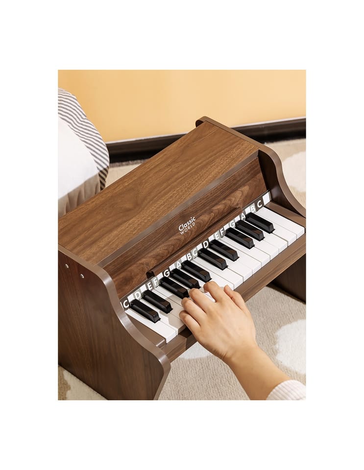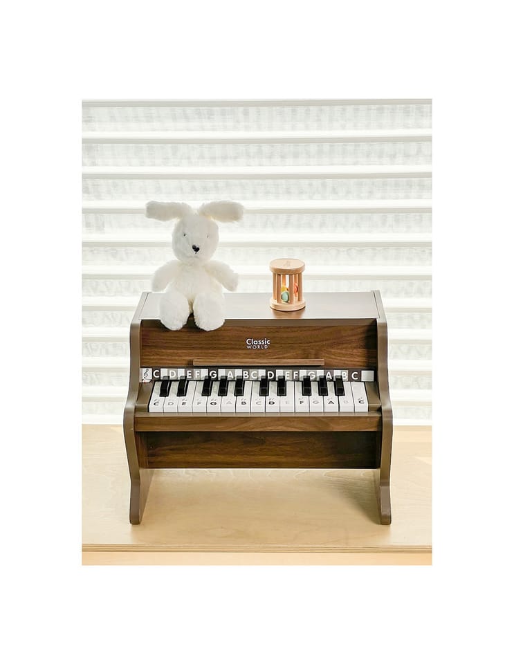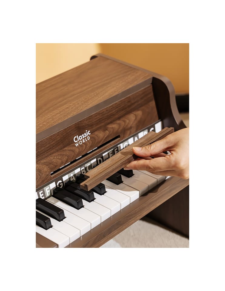 Pianino Classic Modern Natural od marki Classic World to wyjątkowy instrument muzyczny, który wprowadzi Twoje dziecko w fascynujący świat dźwięków. To pięknie wykonane, drewniane pianino charakteryzuje się nie tylko eleganckim, nowoczesnym designem, ale przede wszystkim wysoką jakością wykonania, która zapewnia autentyczność i naturalność brzmienia. Tekstura drewna podkreśla jego wrodzoną czystość i piękno, tworząc przytulną i harmonijną atmosferę w dziecięcym pokoju. Do zestawu dołączona jest książeczka z nutami oraz naklejki, które pomagają dzieciom w łatwiejszym odnajdywaniu odpowiednich klawiszy, sprawiając, że nauka gry staje się prosta i radosna. To idealny pierwszy instrument dla małego wirtuoza, który wspiera rozwój artystyczny od najmłodszych lat.