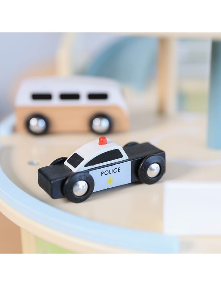 - - 4 drewniane pojazdy: samochód policyjny, autobus, lawetę oraz helikopter
