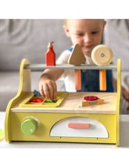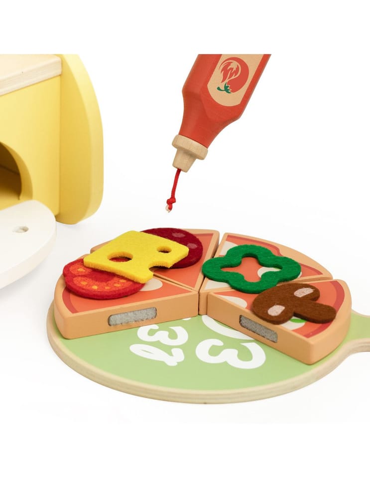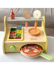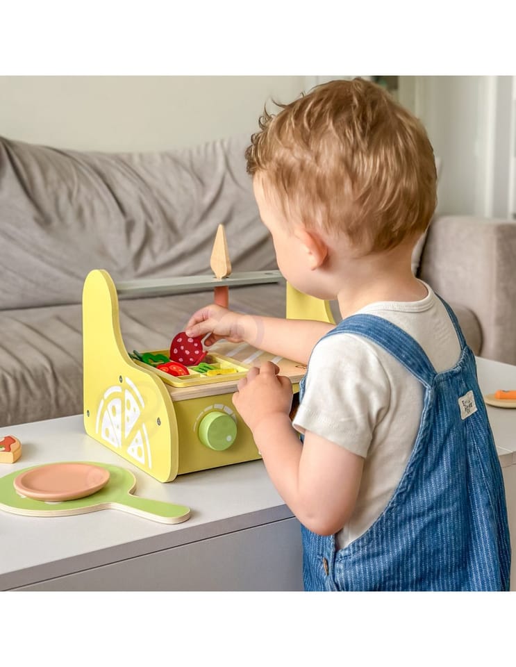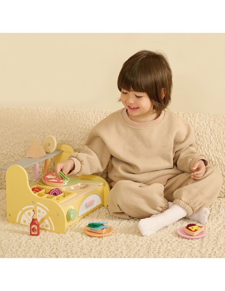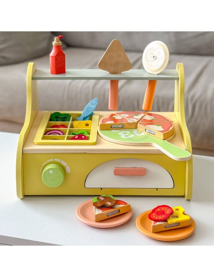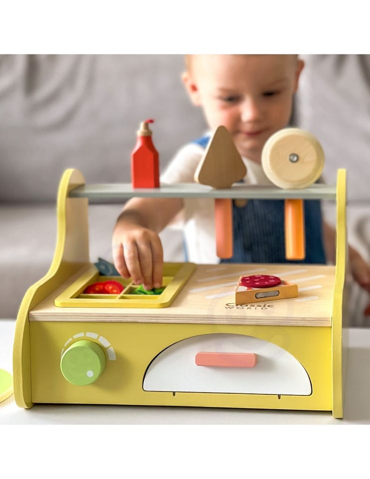 Drewniany piec do pizzy od marki Classic World to kompletny zestaw do zabawy w restaurację, stworzony z myślą o małych kucharzach. Zestaw zawiera ruchome dodatki i elementy do komponowania pizzy, co angażuje dziecko w kreatywne odgrywanie ról. Produkt wykonano z gładkiego drewna, pomalowanego bezpiecznymi, nietoksycznymi farbami — zabawka jest trwała i przyjazna maluchom.