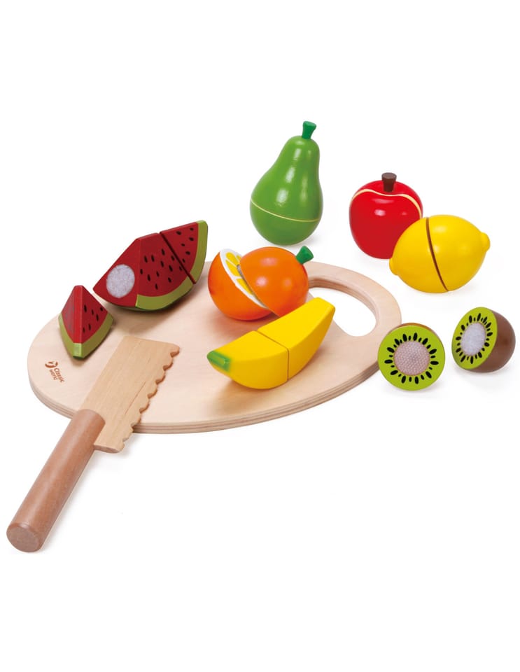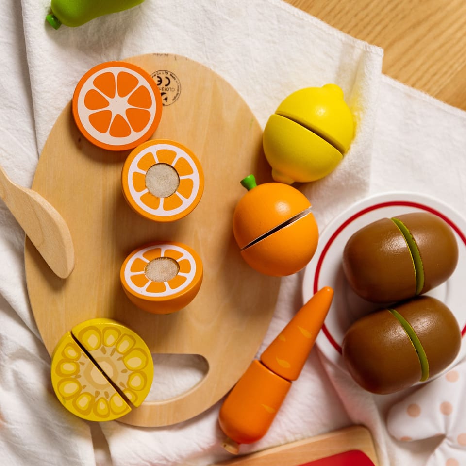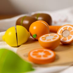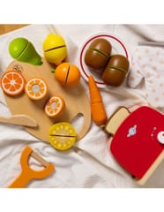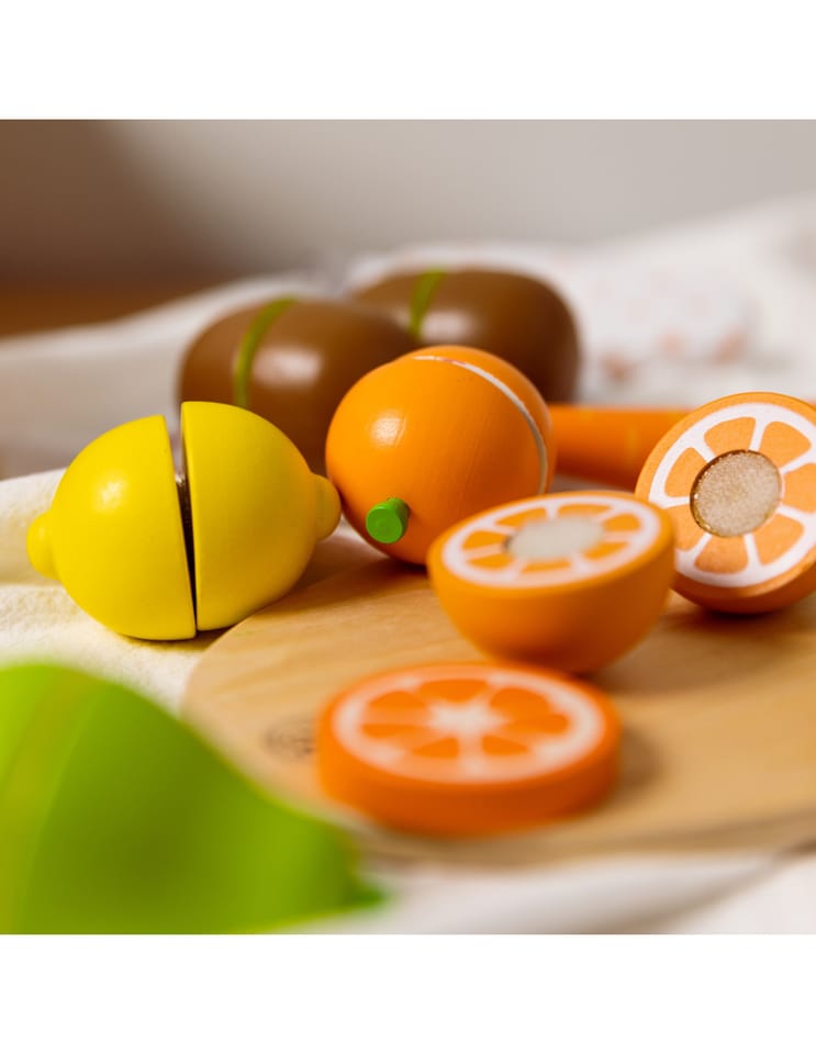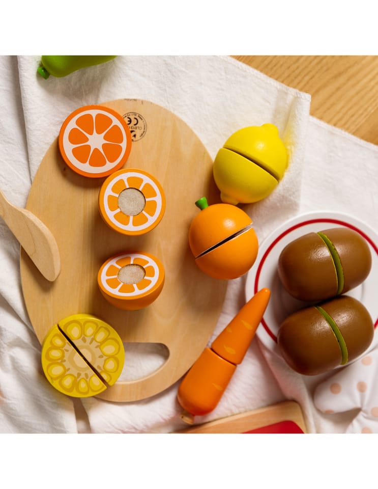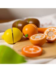 - - Dzieci, które wyjątkowo lubią obserwować co się dzieje w kuchni mogą spróbować swoich sił na drewnianej desce z owocami, których części połączone są za pomocą rzepa.
