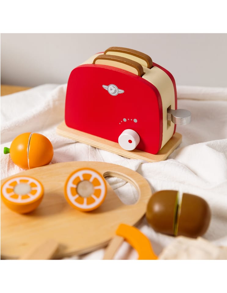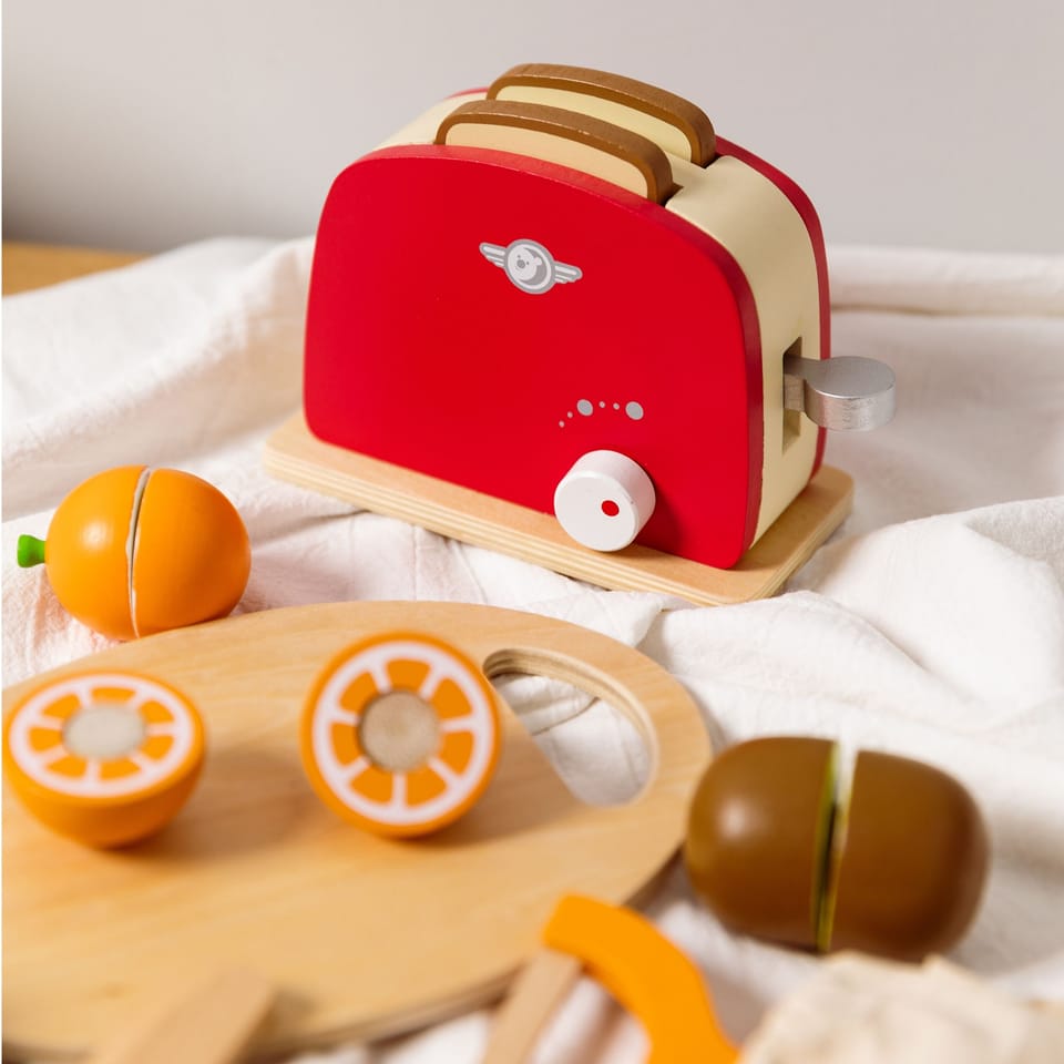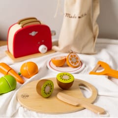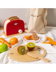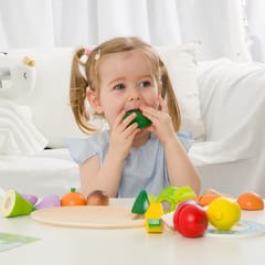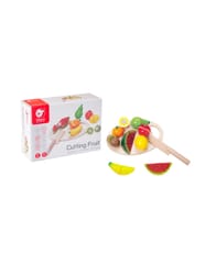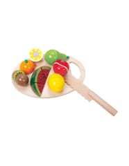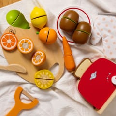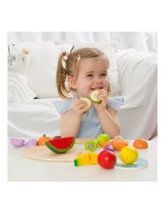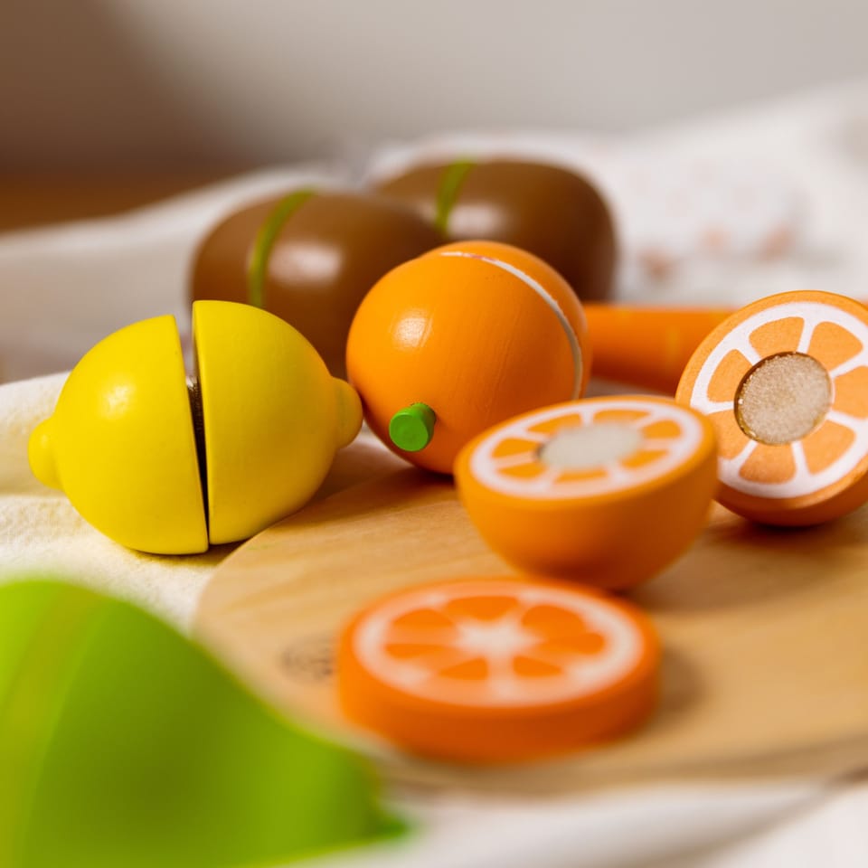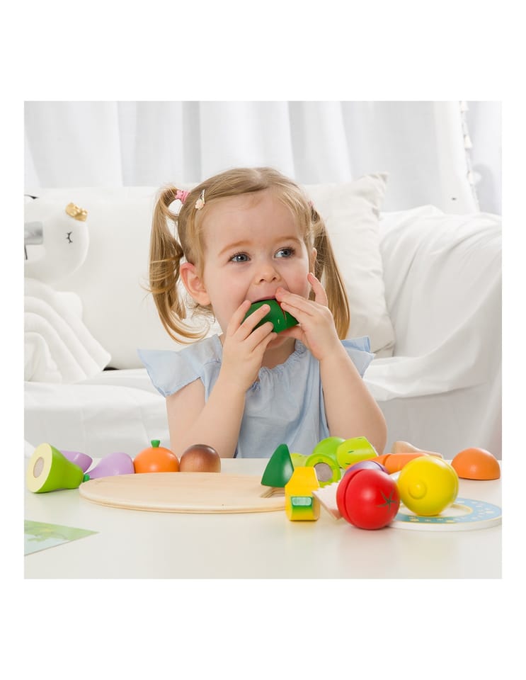 - - Dzieci, które wyjątkowo lubią obserwować co się dzieje w kuchni mogą spróbować swoich sił na drewnianej desce z owocami, których części połączone są za pomocą rzepa.