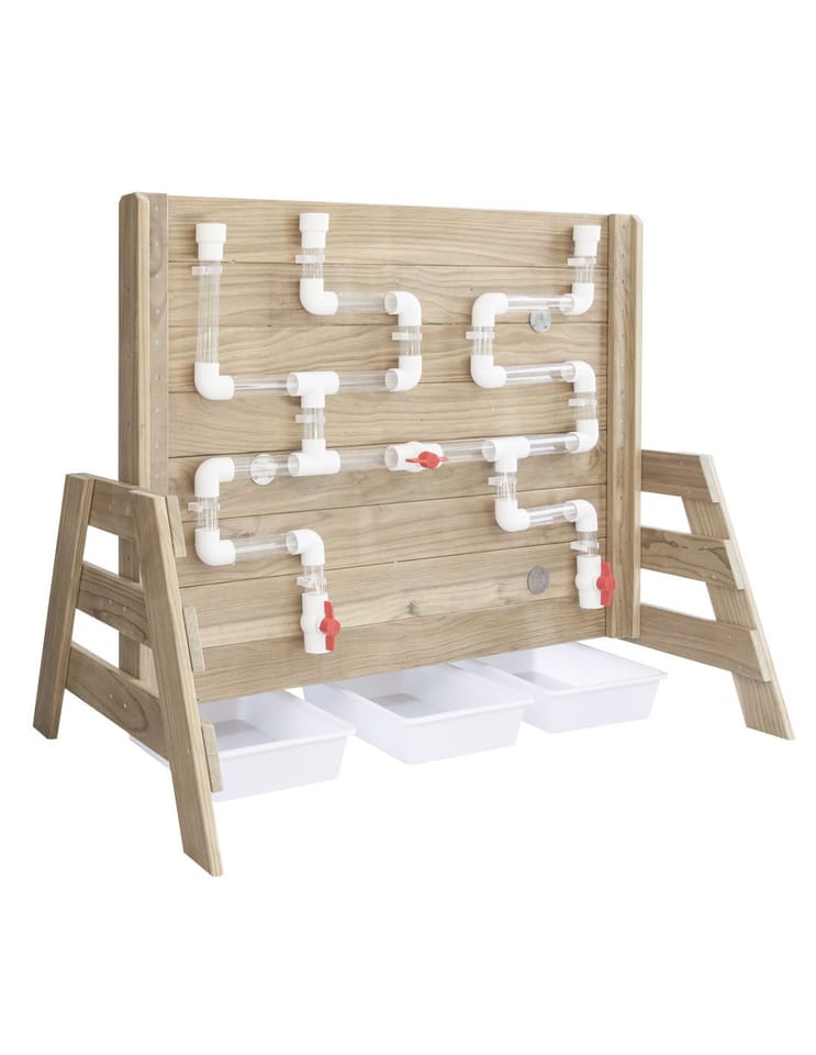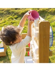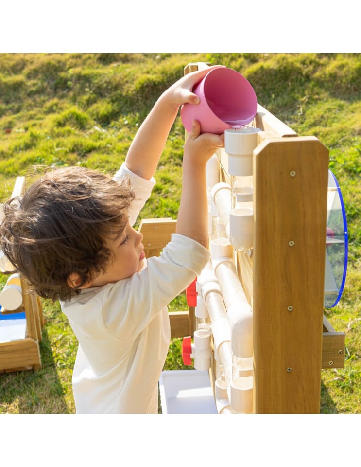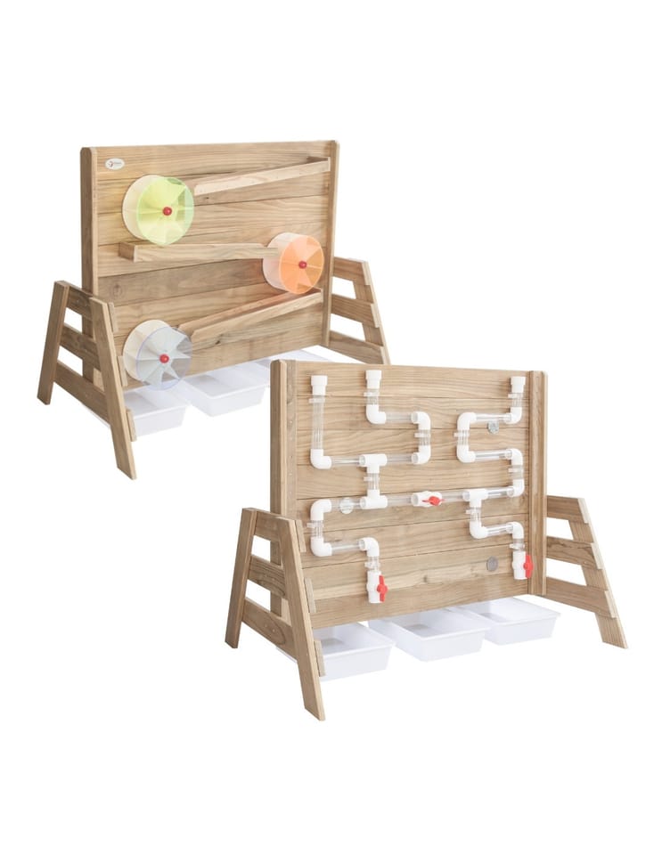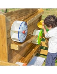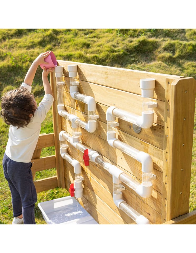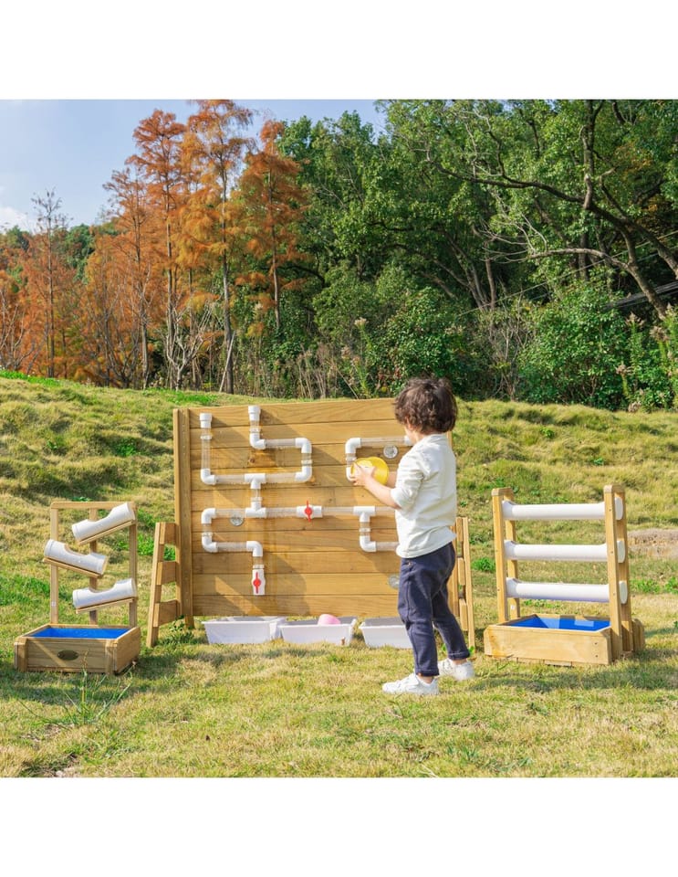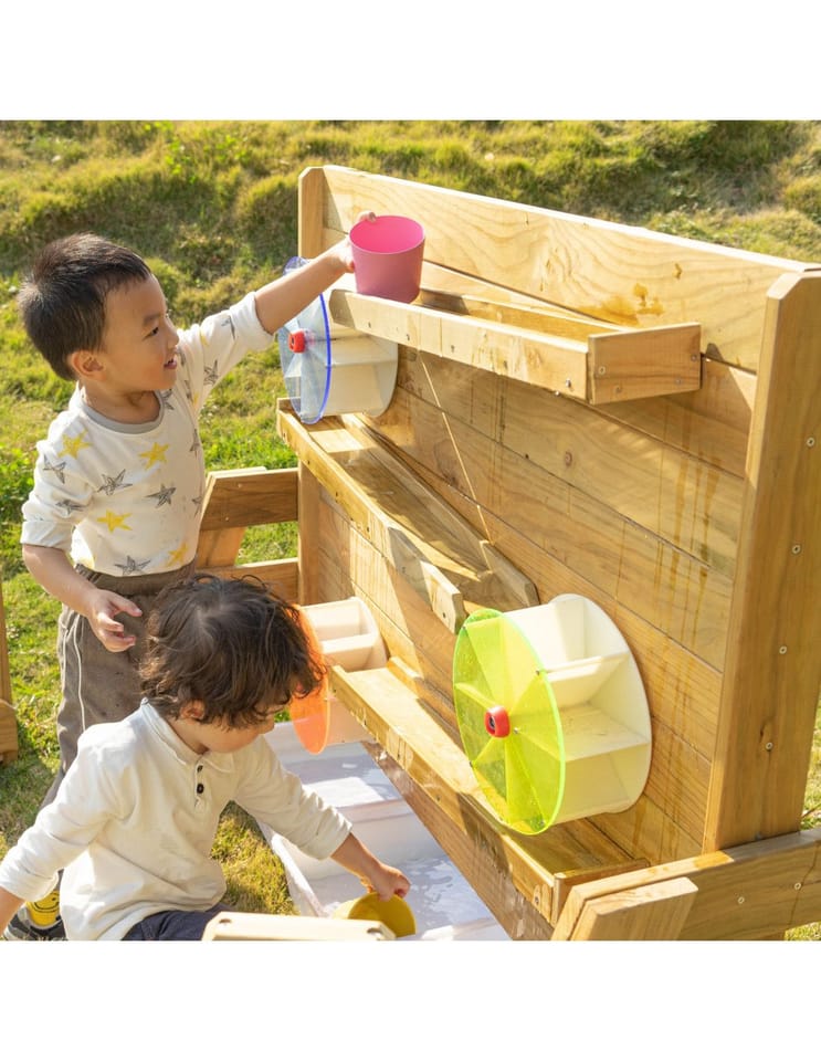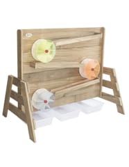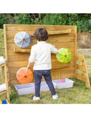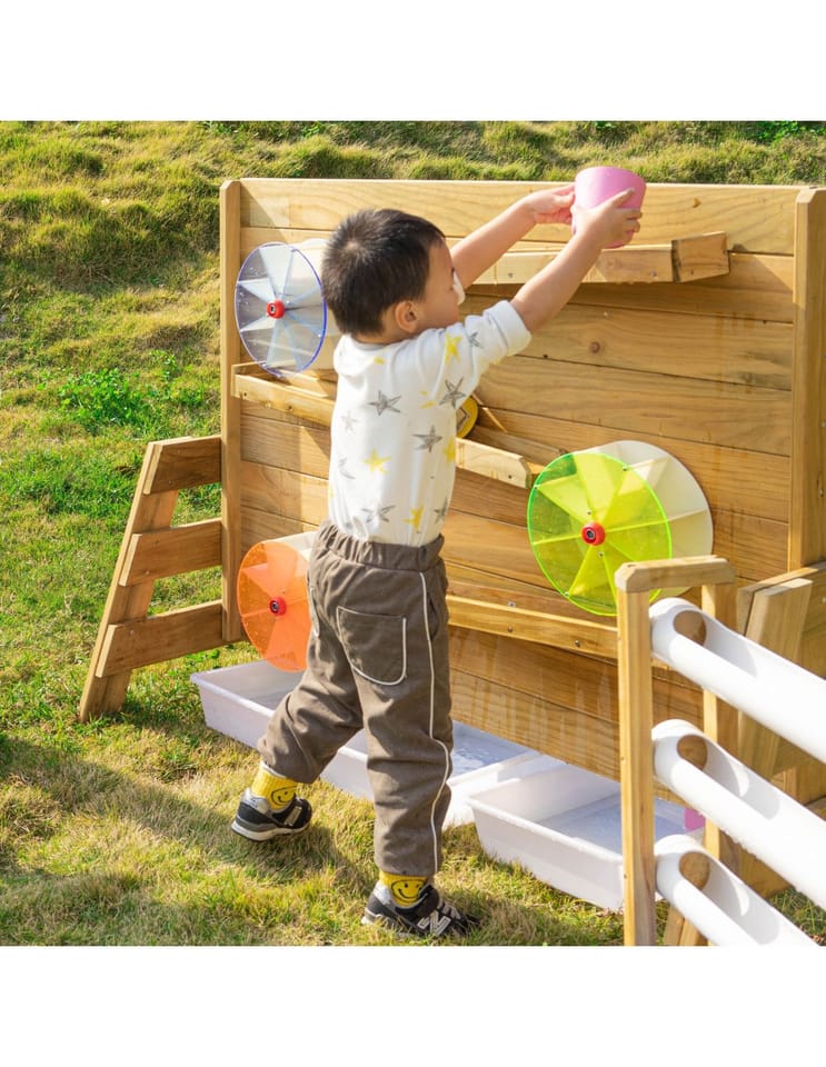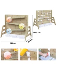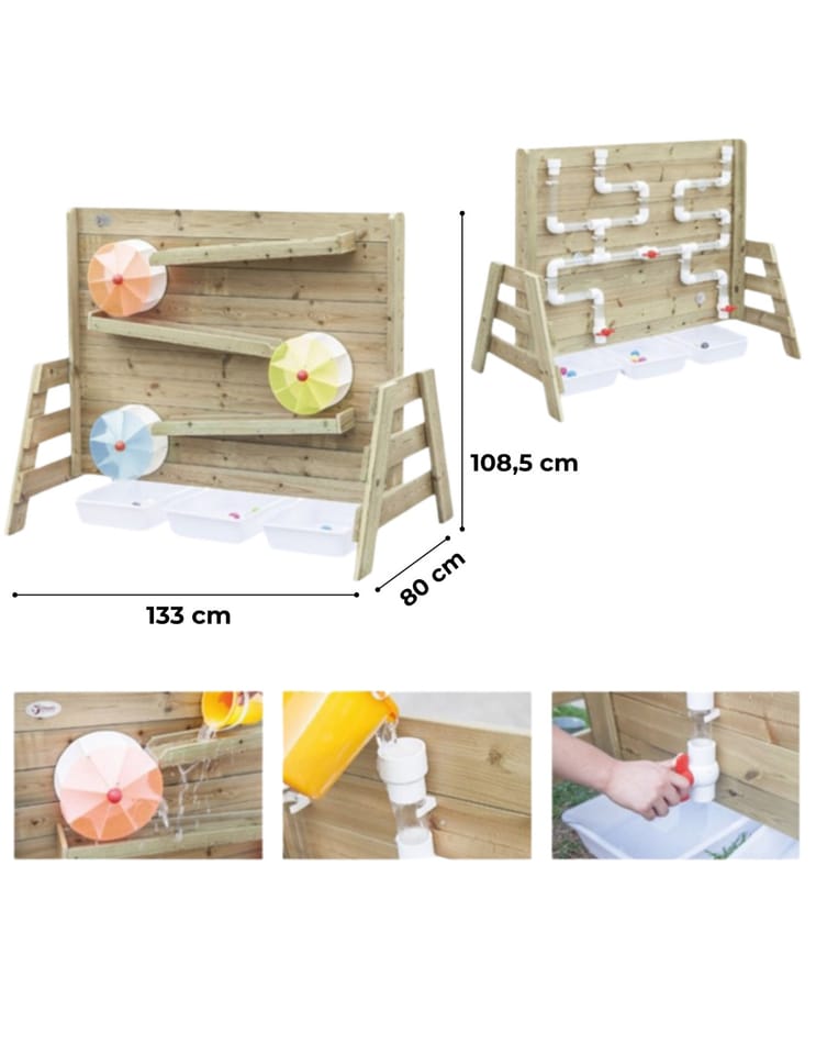 Drewniana Ściana "Zabawa Wodą" od renomowanej marki Classic World to idealne dopełnienie twojego placu zabaw. Produkt jest wyprodukowany z wysokiej jakości drewna, pomalowany nie toksycznym impregnatem, w pełni bezpiecznym dla dzieci. Należy nasypać piasek na drewnianą półkę i obserwować jak obsypuje się w dół, co będzie powodować obracanie się młynku. Z drugiej strony ścianki znajdują się tunele, do których można wlać wodę. Zabawa będzie pełnić funkcję nauki napędzania i wprowadzenia koła w ruch.