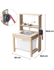 Przepiękna Drewniana Kuchnia Outdoor od renomowanej marki zabawek drewnianych Classic World to świetna propozycja dla dzieci, które lubią wcielać w różne role osób dorosłych podpatrzonych w życiu codziennym. Drewniana zabawka pozwoli na odgrywanie ról, wpłynie także pozytywnie na integrację z innymi dziećmi poprzez wspólną zabawę oraz nauczy odpowiedzialności. Dzieci będą mogły poczuć że są prawdziwymi szefami kuchni, a zabawa w przygotowywanie potraw dla całej rodziny nie będzie miała końca. W kuchni znajduje się miejsce, aby podłączyć dopływ wody, wystarczy podstawić plastikowy pojemnik, żeby woda miała, gdzie spływać.