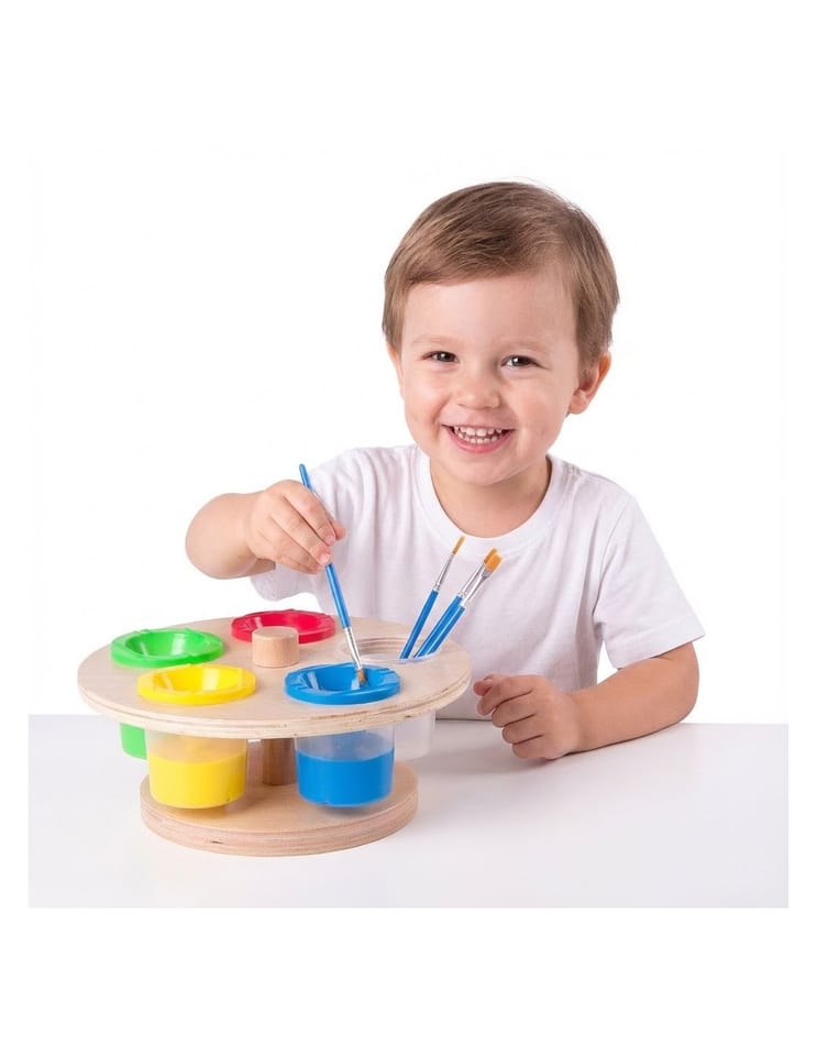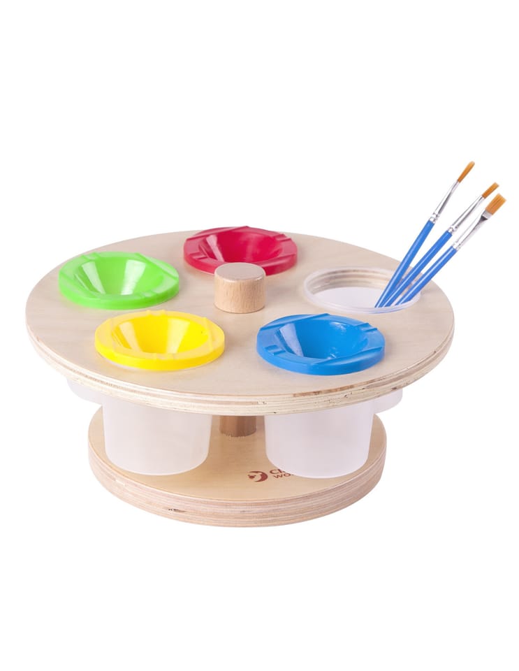 Obrotowy Stojak na Farby od marki CLASSIC WORLD to drewniany, dobrej jakości produkt.Posiada on 5 plastikowych kubeczków na farby z zamknięciem. Stojak jest odpowiedni dla dzieci- nie posiada ostrych krawędzi oraz jest stabilny. Dzięki zamykanym pojemnikom farby są chronione przed wyschnięciem. Obrotowy stojak na farby idealnie nada się także do przedszkoli i innych placówek edukacyjnych, dzięki niemu dzieci nie będą przewracały farbek brudząc przy tym siebie i swojej najbliższej przestrzeni. To także świetny pomysł do użytku domowego, jeśli twoja pociecha jest małym artystą- od dziś pomalowane będą tylko kartki !Charakterystyka: - Stojak ułatwi organizację miejsca pracy - Dzięki stojakowi na stoliku będzie więcej przestrzeni dla dziecka - Drewniana konstrukcja gwarantuje dobre wykonanie i trwałość - Dzięki dobremu uporządkowaniu, dzieci będą bardziej zmotywowane do malowania!