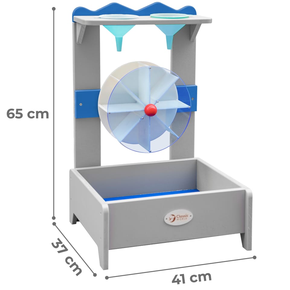 Zabawka Wodna dla dzieci od renomowanej marki Classic World to idealne dopełnienie twojej piaskownicy!, pomalowany nietoksycznym impregnatem, w pełni bezpiecznym dla dzieci. Po prostu napełnij lejki wodą i obserwuj jak spływa do kołowrotka powodując jego kręcenie. Wyposażony w dwa lejki na górze, przez które przepływa woda napędzająca obrót koła. Zabawka zachęca dzieci do kreatywności i odkrywania. Wybór lejków określa kierunek obrotu koła, zgodnie z ruchem wskazówek zegara lub przeciwnie do ruchu wskazówek zegara.