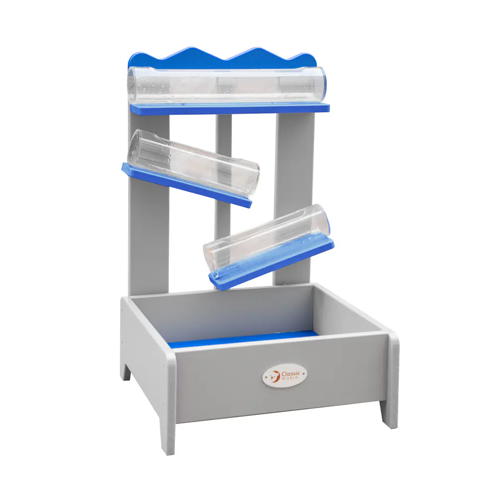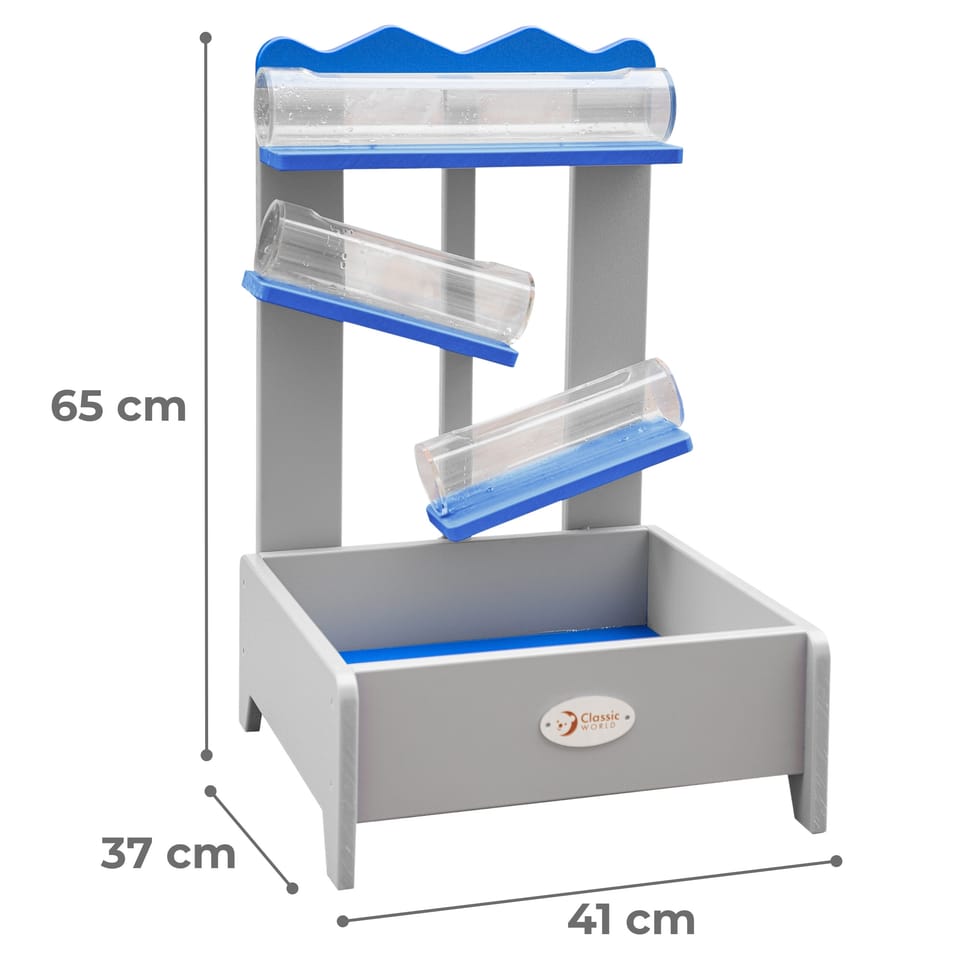 Zabawka Wodna dla dzieci od renomowanej marki Classic World to świetny zestaw doświadczalny do piaskownicy twojego dziecka ale także do placówek edukacyjnych. Po prostu napełnij rynienkę wodą i obserwuj jak przez małą dziurkę woda spływa z jednej do drugiej tworząc mini basen. Woda kapie z górnej przezroczystej rurki i spływa wzdłużdwóch pozostałych rurek. To ćwiczenie pomaga rozwijać wiedzę dzieci na temat płynność wody, piasku czy kulek.
