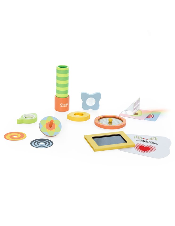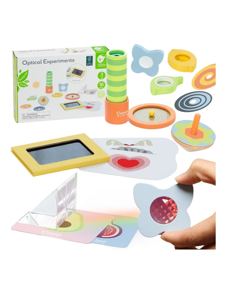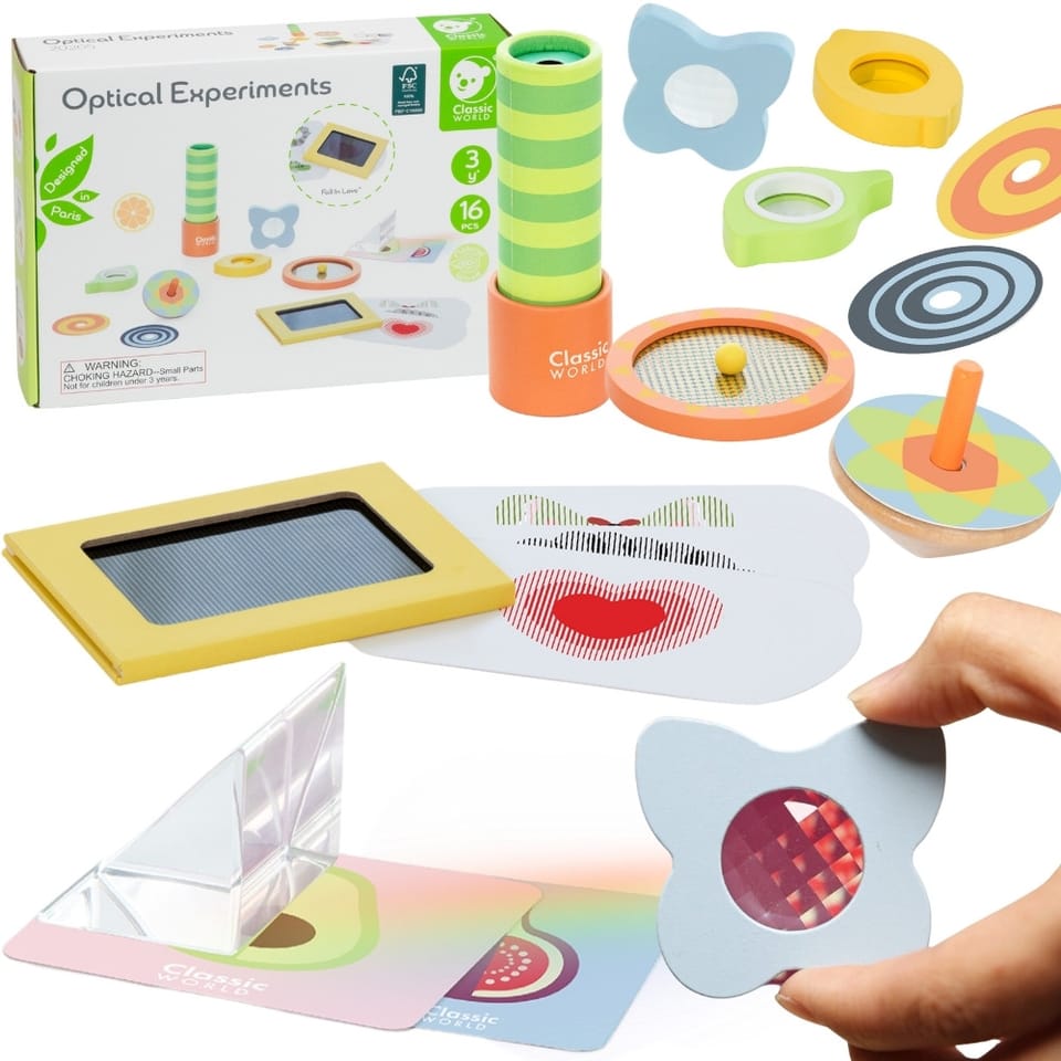 Zestaw Do Nauki Optyki od marki Classic World to fascynująca podróż w świat światła, kolorów i iluzji dla każdego małego naukowca. Ta edukacyjna zabawka pozwala dziecku odkrywać zasady fizyki poprzez bezpieczną i kreatywną zabawę. Zestaw składa się z różnorodnych elementów, takich jak soczewki, lusterka i bączki, które zmieniają sposób postrzegania otoczenia. Dzięki niemu maluch dowie się, jak działają pryzmaty, jak mieszają się barwy i czym jest zjawisko odbicia. Całość wykonana jest z wysokiej jakości drewna i bezpiecznych materiałów, co gwarantuje trwałość i bezpieczeństwo użytkowania. To idealny sposób na połączenie nauki z radością odkrywania, rozbudzając w dziecku ciekawość świata.