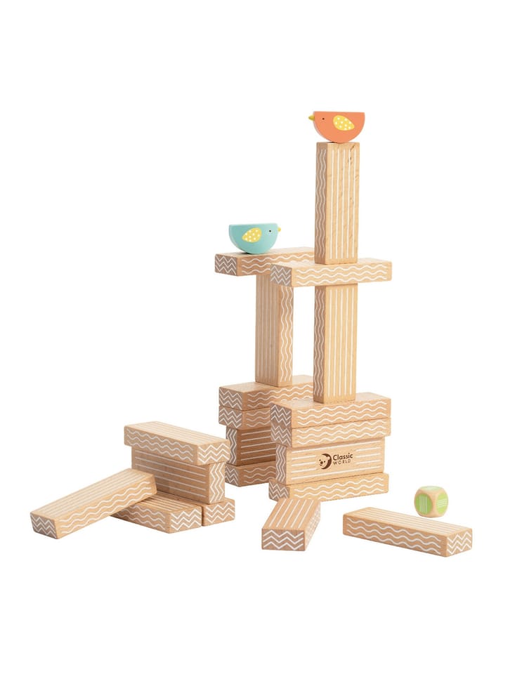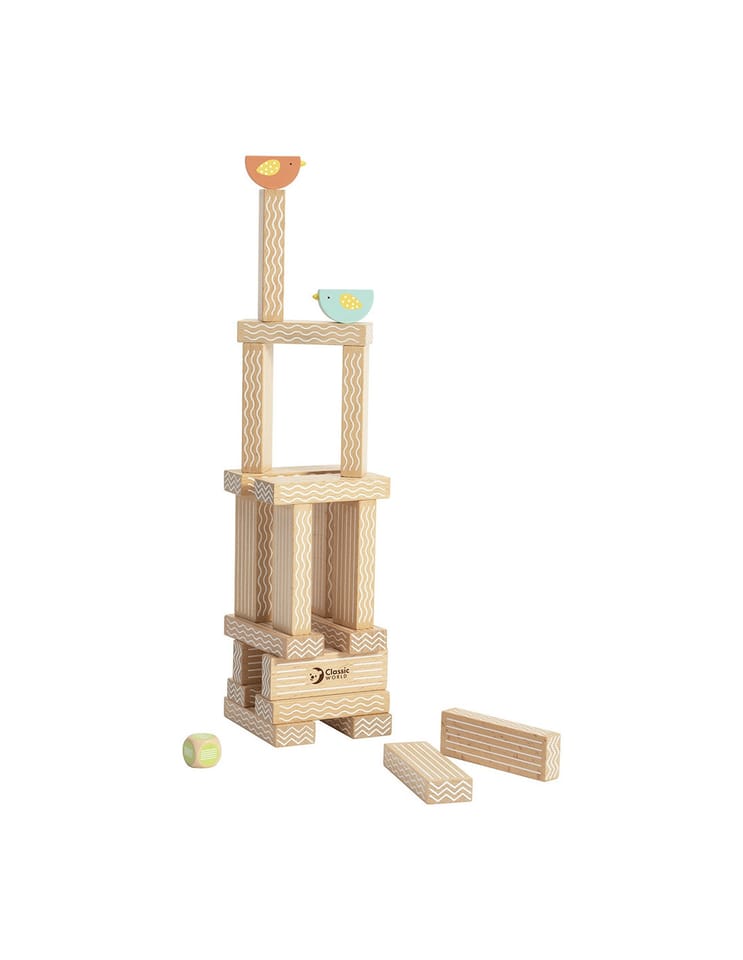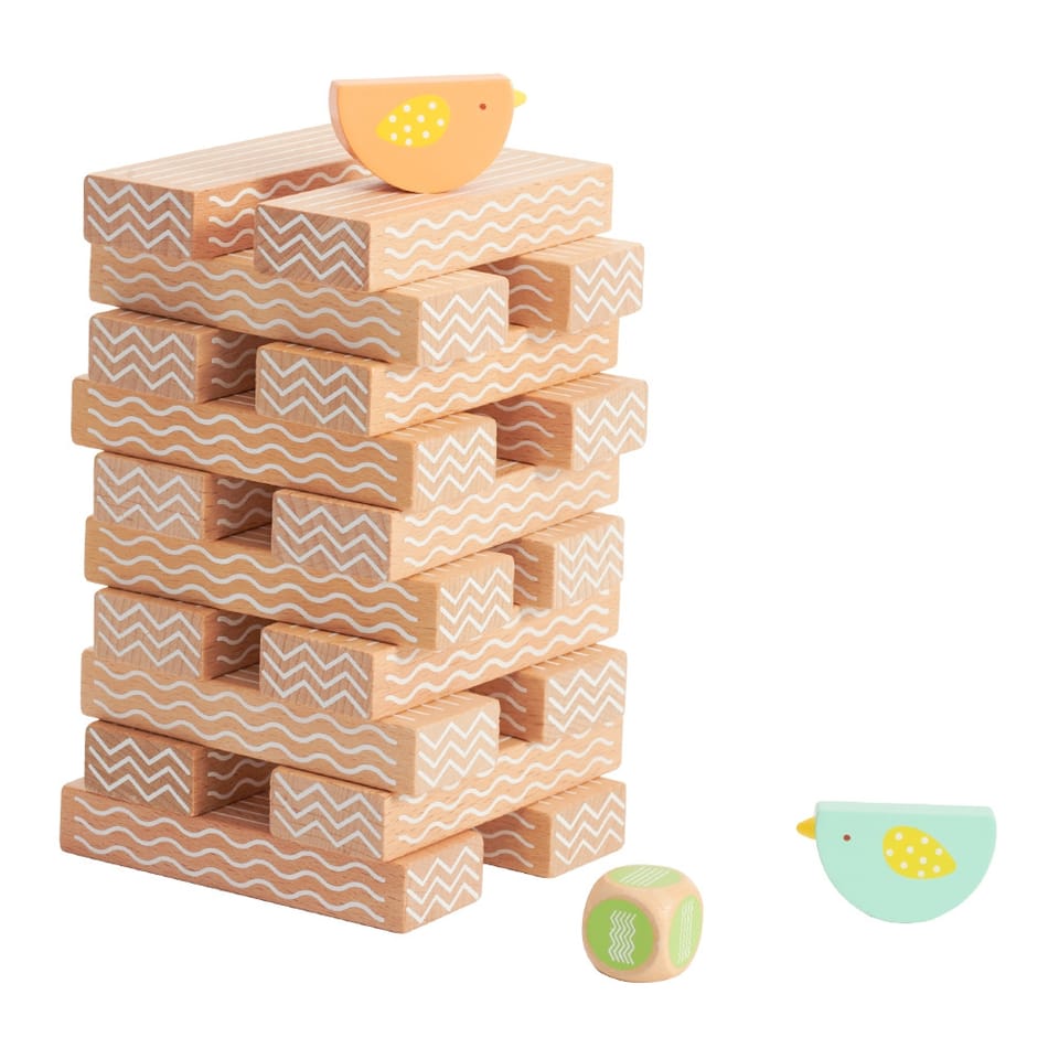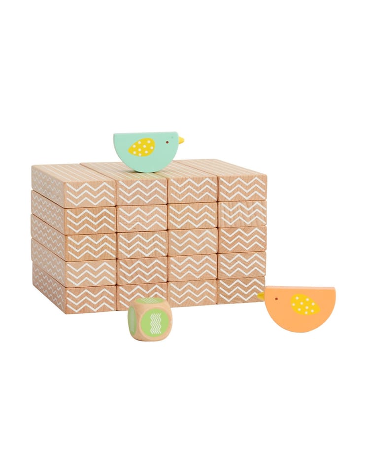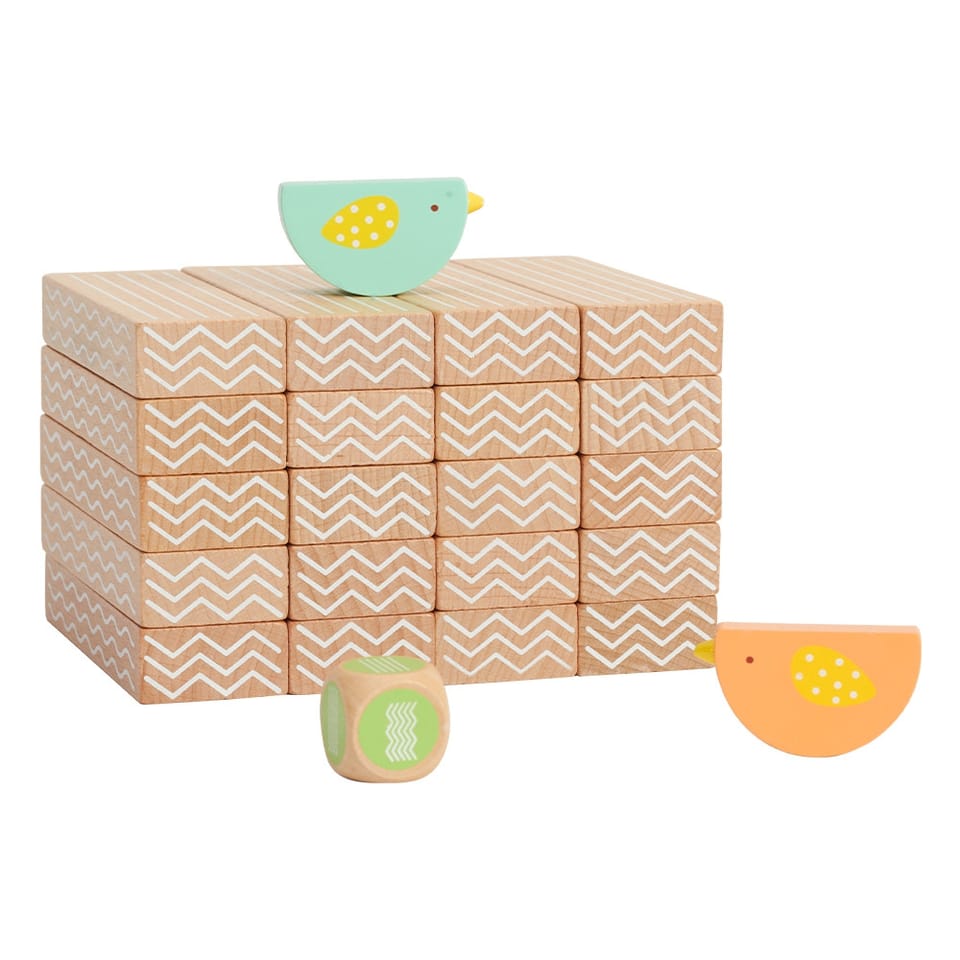 - - w zestawie: 20 klocków, 2x ptaki oraz kostkę do gry.