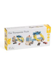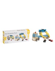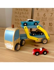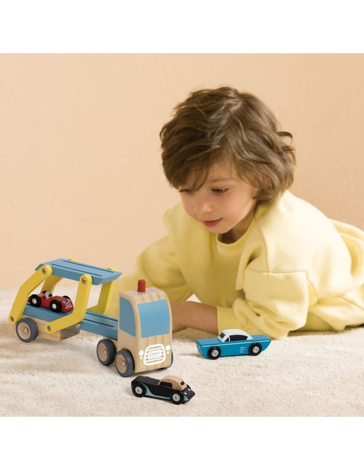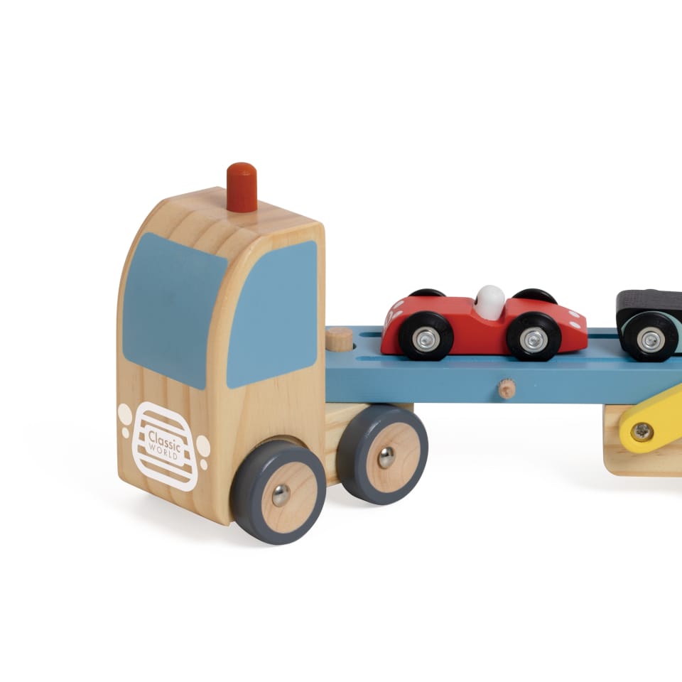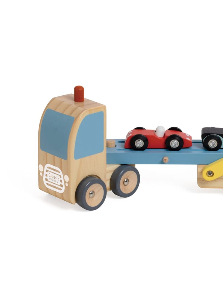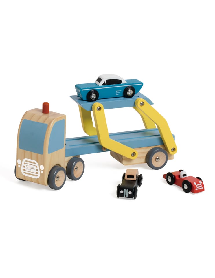 Drewniany transporter samochodowy od marki CLASSIC WORLD to trwały i wysokiej jakości zestaw zabawek, który zawiera 1 ciężarówkę, najazd z platformą i 3 pojazdy. Zabawka pomaga dzieciom rozwijać umiejętności motoryczne oraz koordynację ręka-oko, zapewniając jednocześnie wiele godzin zabawy przy załadunku i rozładunku.