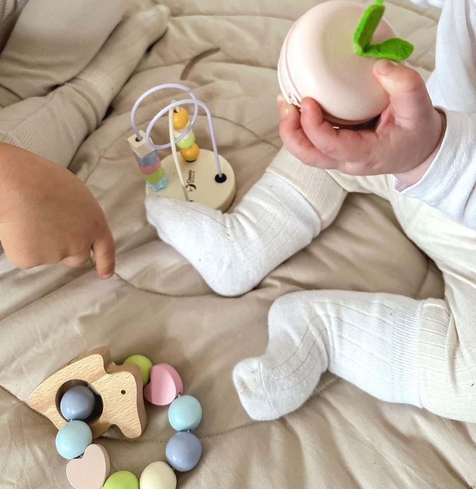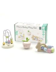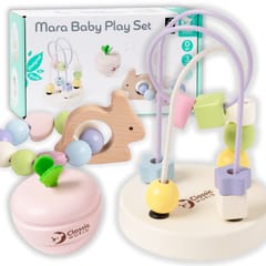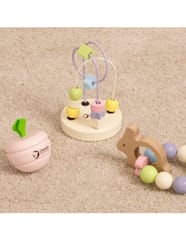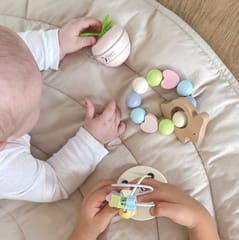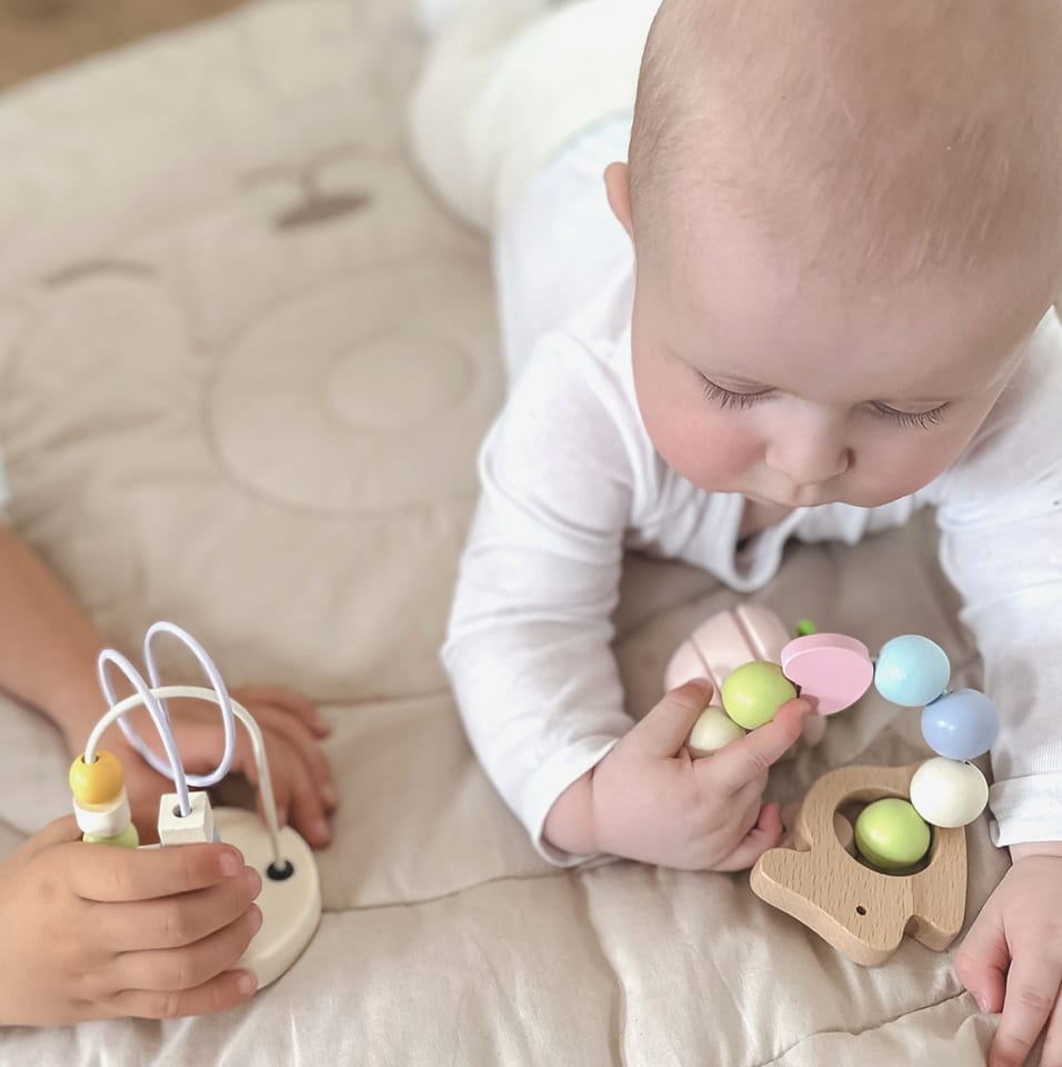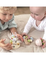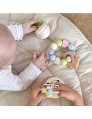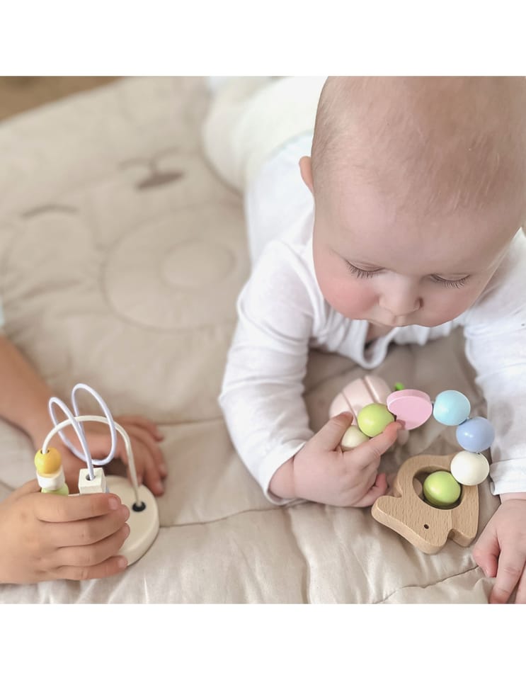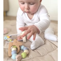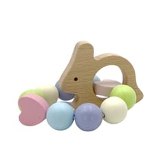 - - 1x Drewniana grzechotka w kształcie króliczka, połączona z koralikami do przesuwania.