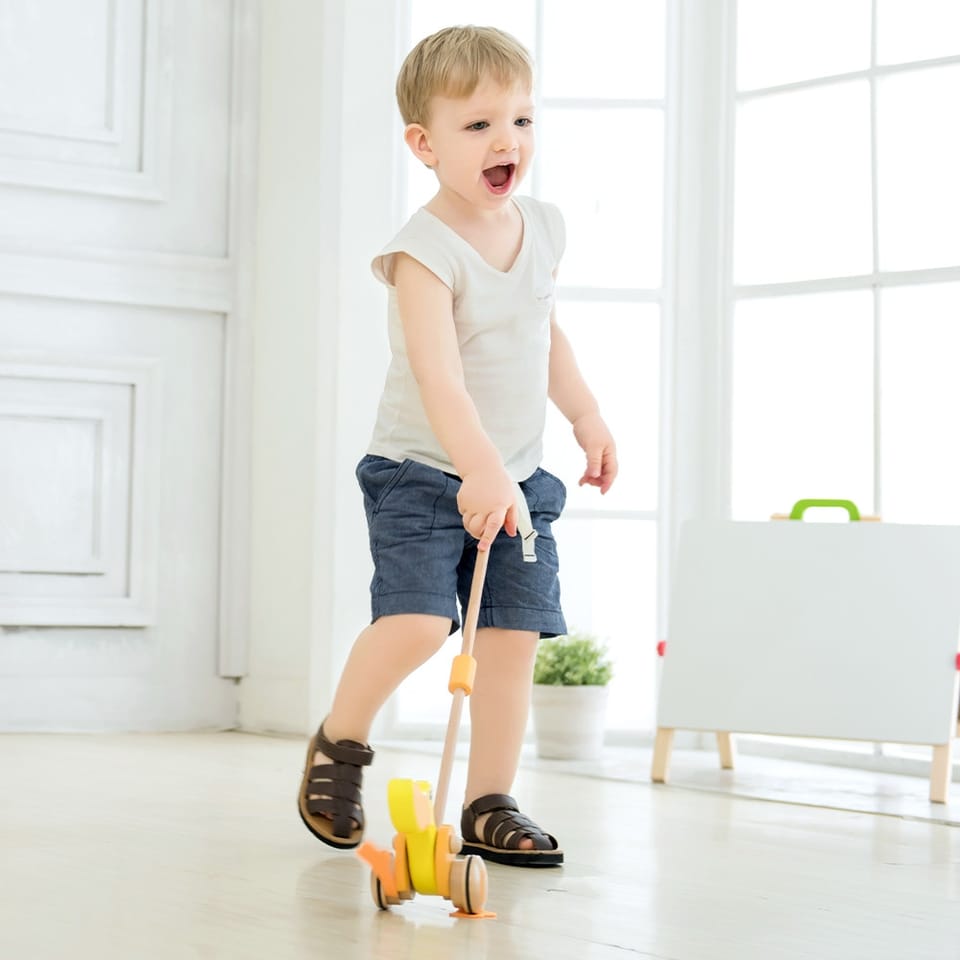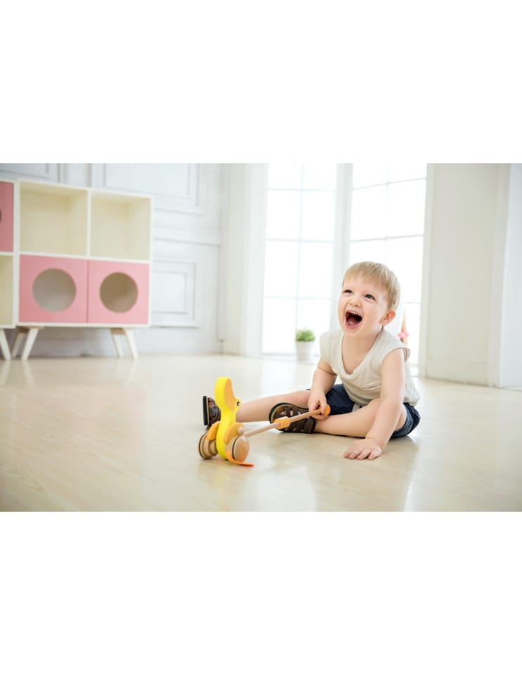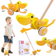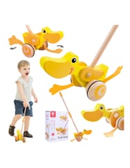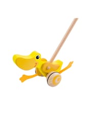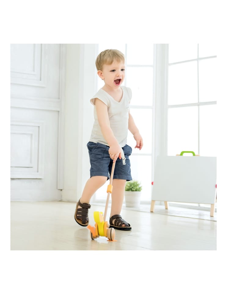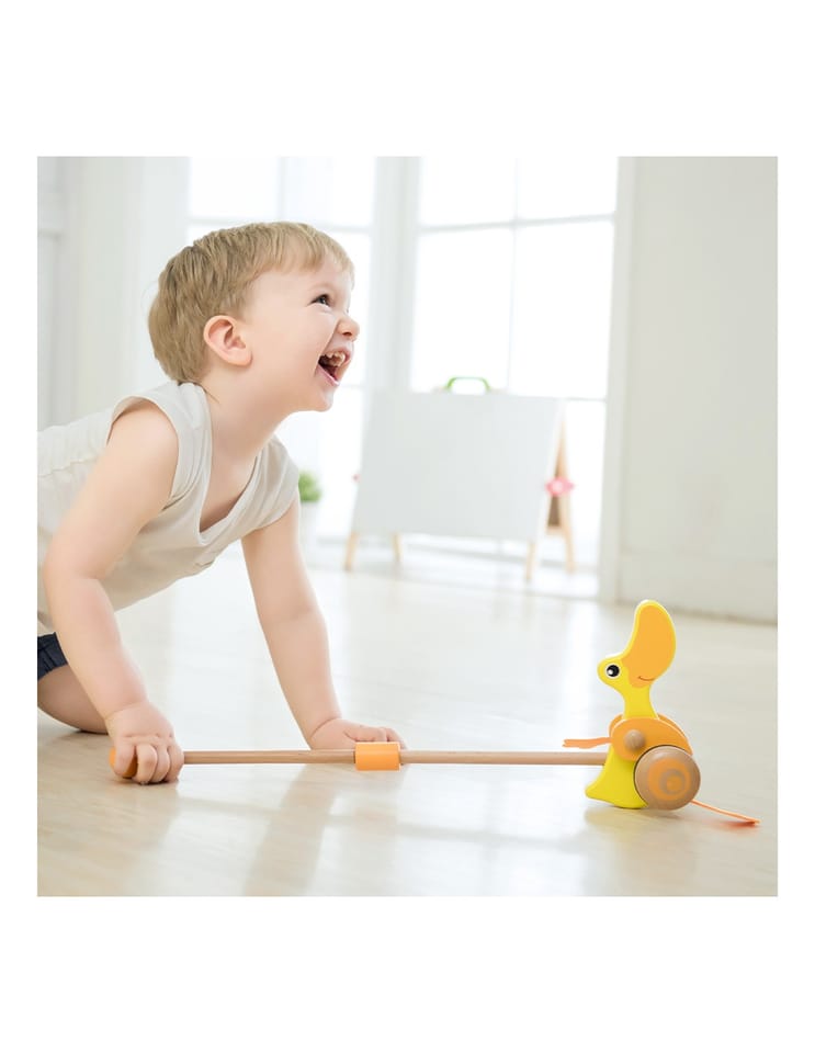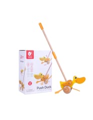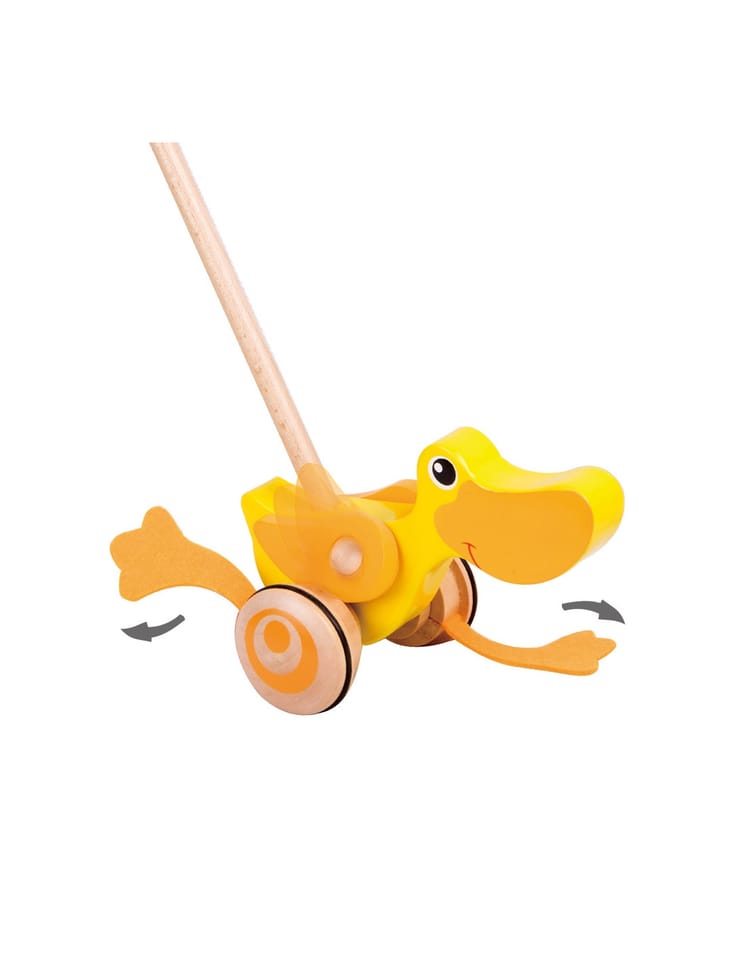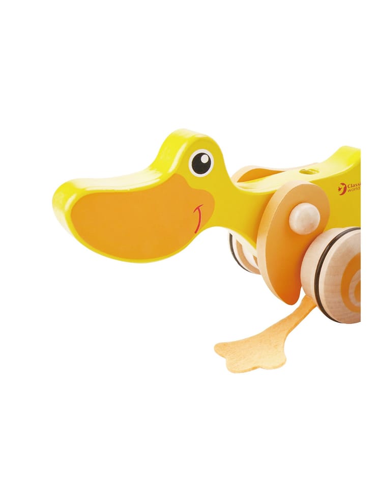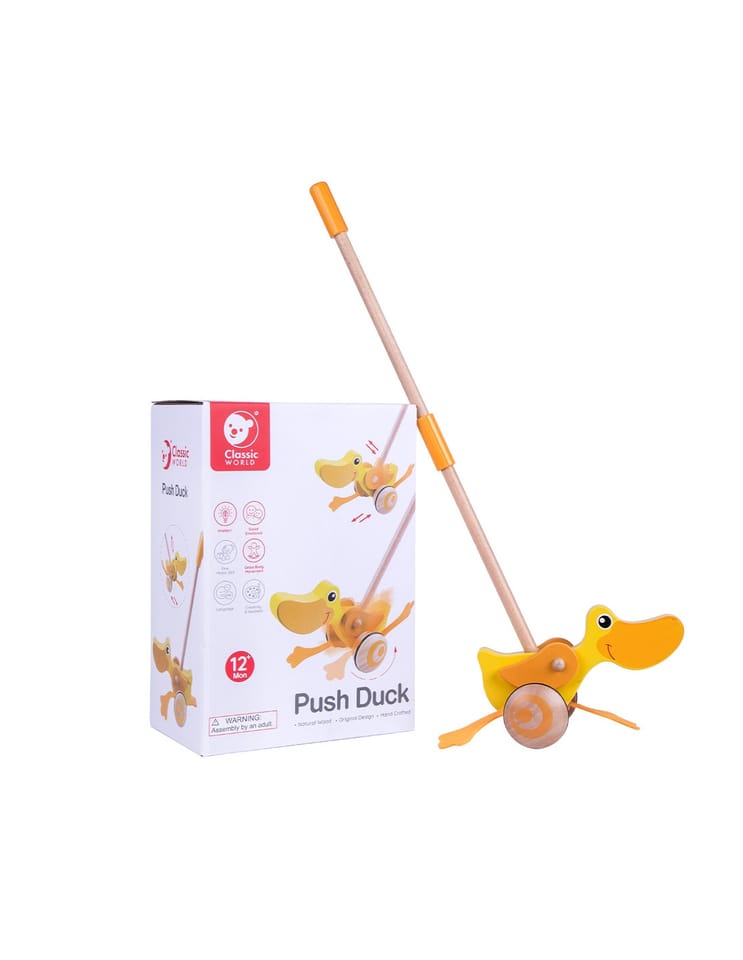 Drewniana zabawka do pchania marki Classic World. Dzieci mogą ćwiczyć chodzenie, prowadząc przed sobą ulubioną zabawkę. Podczas jeżdżenia, kaczuszka klapie płetwami, powodując u maluszka śmiech i radość. Kaczuszka to bestsellerowa zabawka marki Classic World.