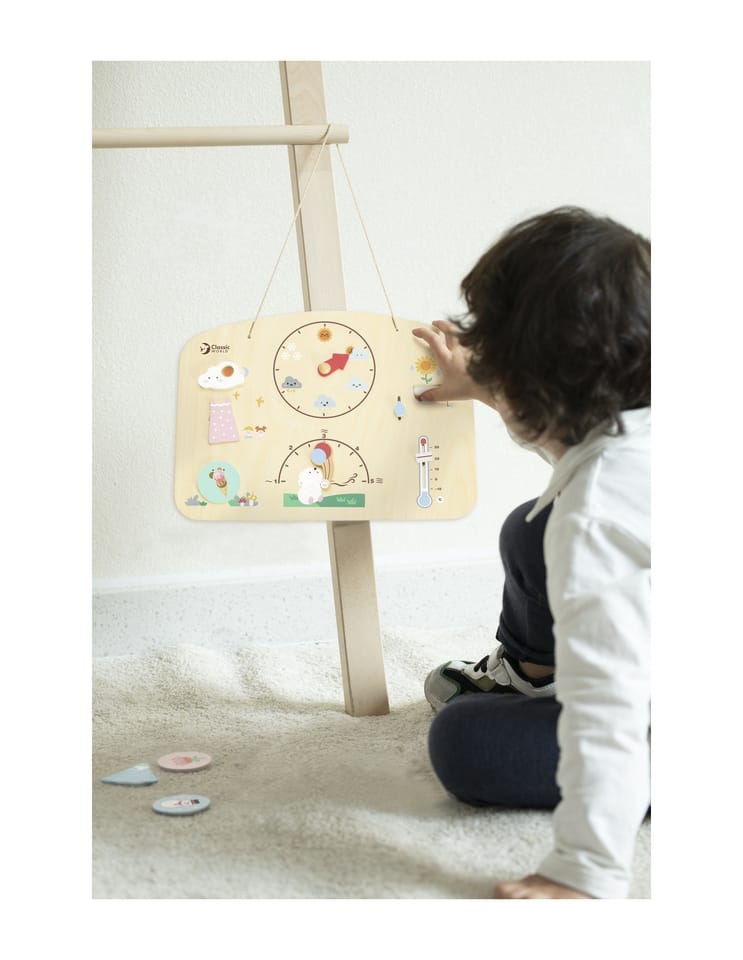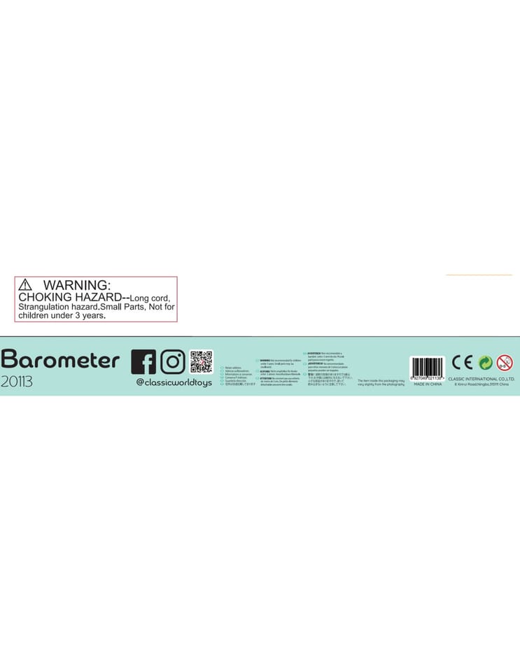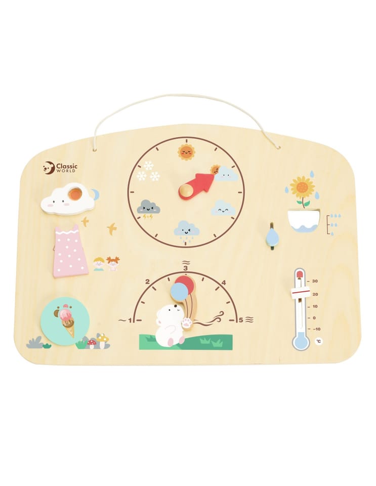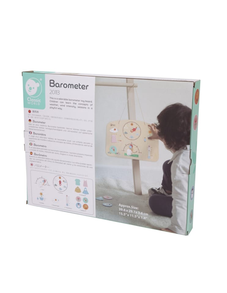 Edukacyjny Barometr od renomowanej marki Classic World to idealny produkt do nauki pogody. Edukacyjna zabawka jest wykonana z wysokiej jakości drewna, pomalowanego nietoksycznymi farbami bezpiecznymi dla dzieci. Barometr posiada zaznaczanie pogody jaką mamy obecnie, ilość opadów , siłę wiatru oraz temperaturę którą mamy na dworze. Dziecko może zabrać barometr w podróż i na bieżąco ustawiać warunki pogodowe za oknem.