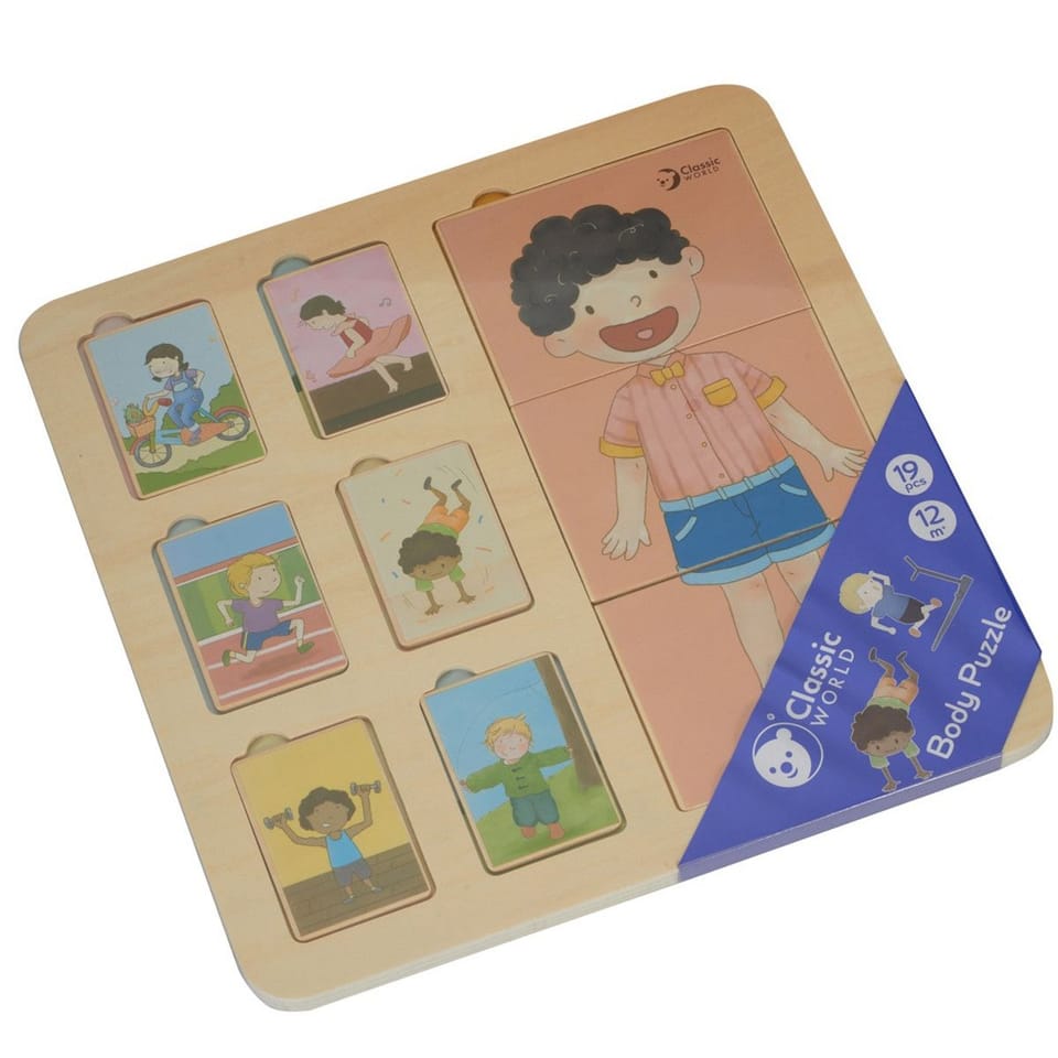 Drewniane Kolorowe Klocki od Classic World dla dzieci od 12 miesiąca życia to idealne rozwiązanie do domu, jak i do przedszkola. Składa się z planszy na której jest 18 kolorowych klocuszków z namalowanymi dziećmi które wykonują różne ćwiczenia, oraz plansza. Do planszy trzeba odpowiednio dopasować element tak by powstał cały obrazek. Na drewnianej podstawce znajdują się wgłębienia, które swoim kształtem odpowiadają kolorowym puzzlom. Dzięki zabawce dziecko rozwija koordynację wzrokowo-ruchową.