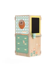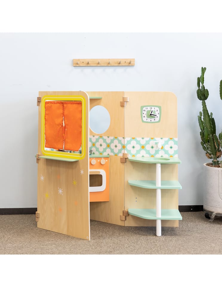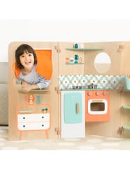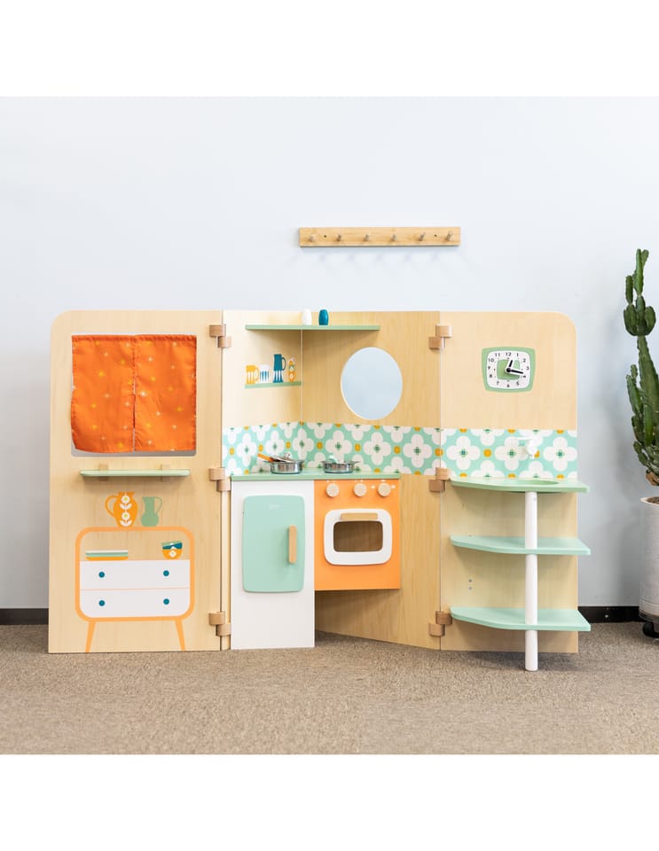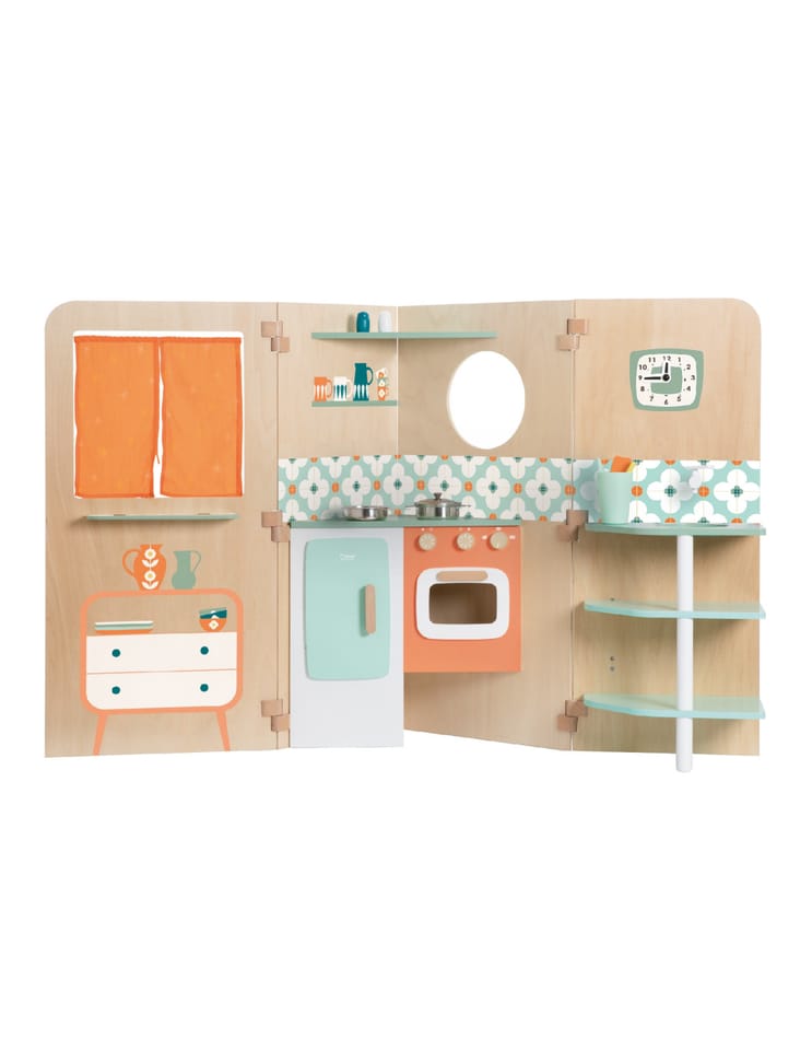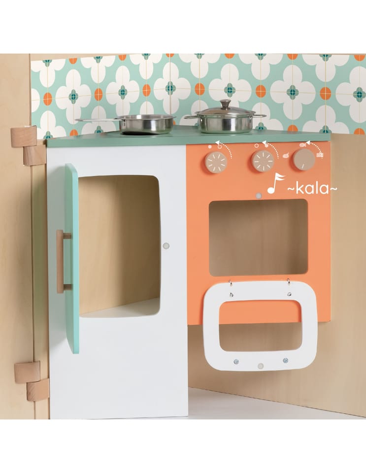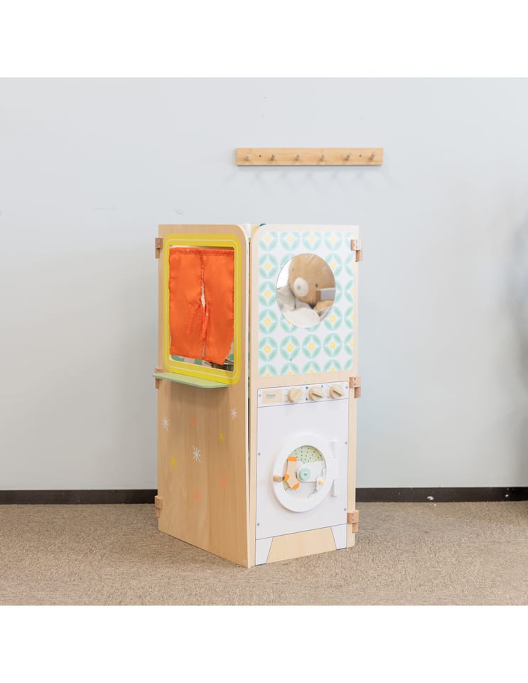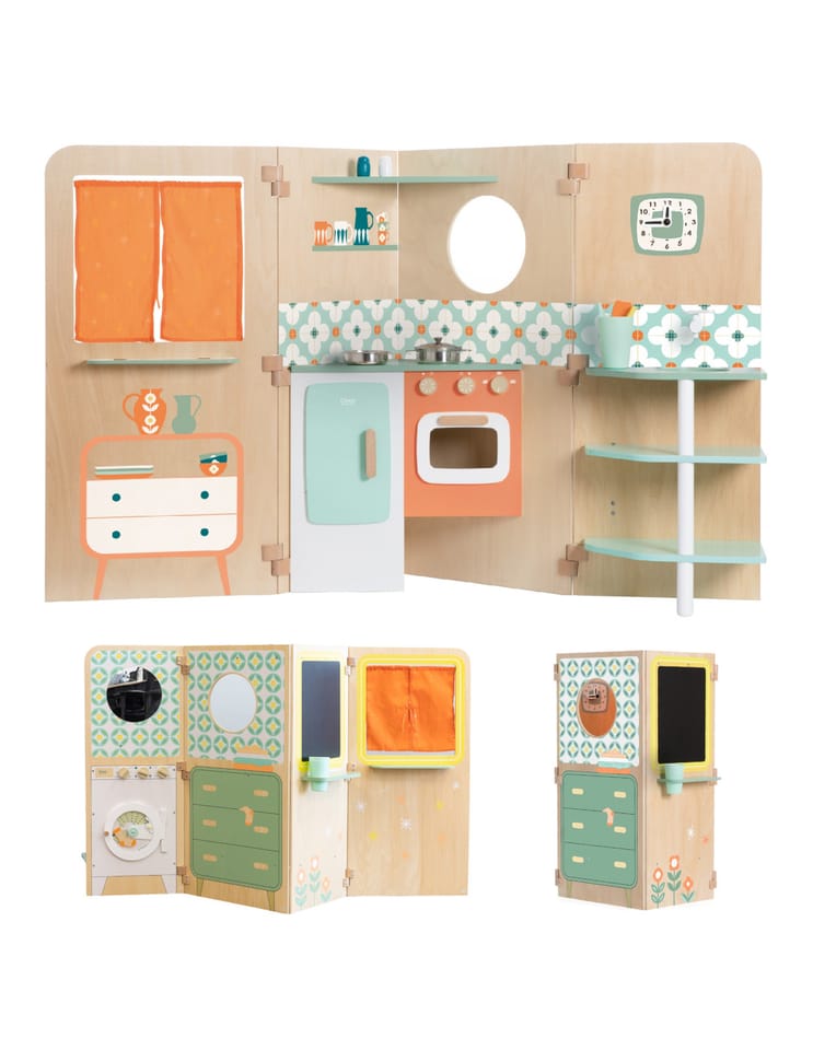 Wielofunkcyjny składany domek od marki CLASSIC WORLD daje nieograniczone możliwości zabawy. Odsłania różne przestrzenie do zabawy, takie jak kuchnia, a także pralnia z pralką, tablica magnetyczna i okno. Może być również wykorzystywany jako teatr kukiełkowy. Dzieci mogą bawić się „na zewnątrz” i „wewnątrz”, patrząc przez okno. Składany domek jest bardzo kompaktowy a dzięki dobremu systemowi otwierania i składania, nie zajmuje dużo miejsca.