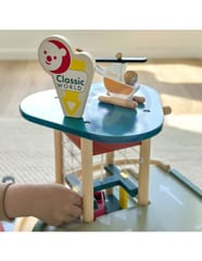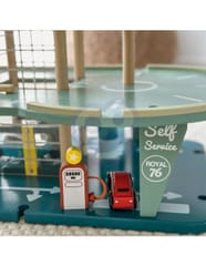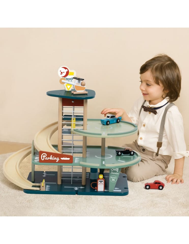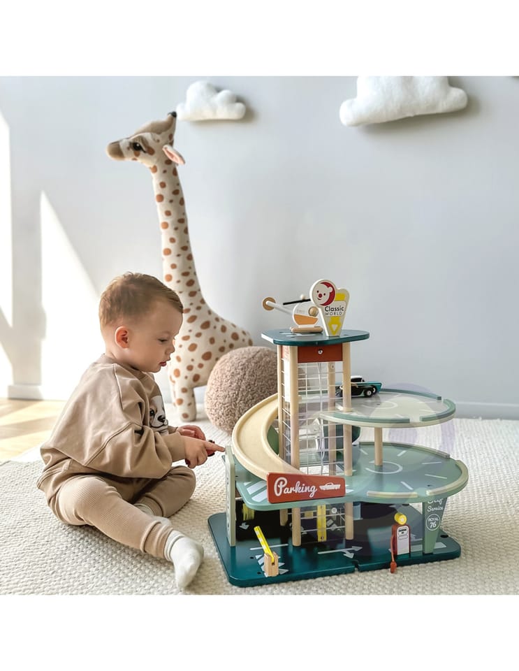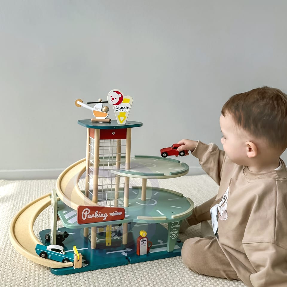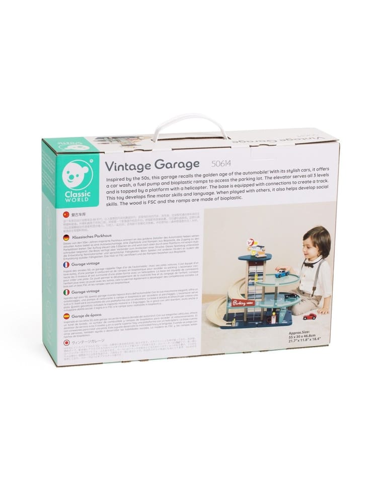 Drewniany Garaż Vintage od marki CLASSIC WORLD to wyjątkowa zabawka, która przeniesie Twoje dziecko w złote czasy motoryzacji lat 50. Ten stylowy, trzypoziomowy parking został wykonany z najwyższej jakości drewna FSC oraz innowacyjnych elementów z bioplastiku, co czyni go bezpiecznym i ekologicznym wyborem. Zestaw oferuje mnóstwo atrakcji, w tym funkcjonalną windę, myjnię, dystrybutor paliwa oraz lądowisko dla helikoptera, zapewniając godziny kreatywnej zabawy. Dzięki możliwości łączenia bazy z innymi torami, Garaż Vintage staje się centrum rozbudowanego świata małego fana motoryzacji.