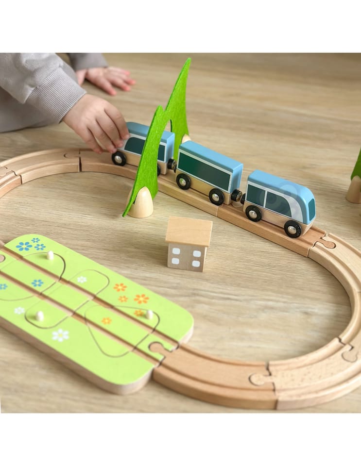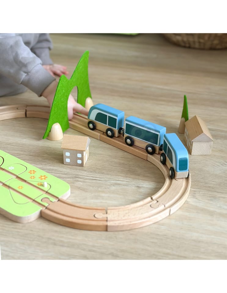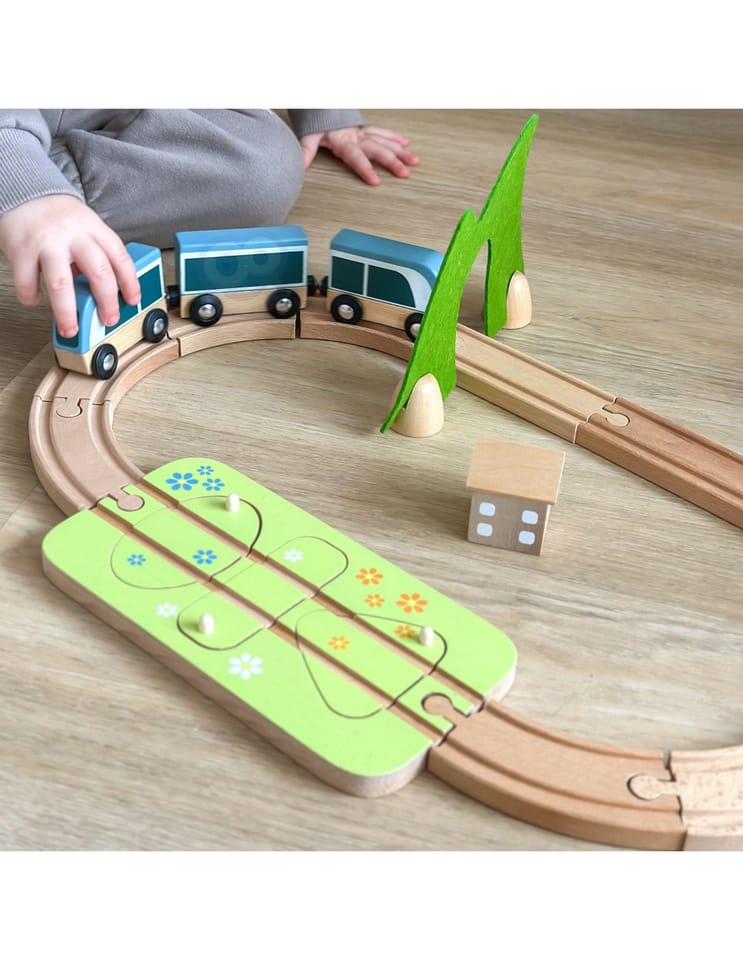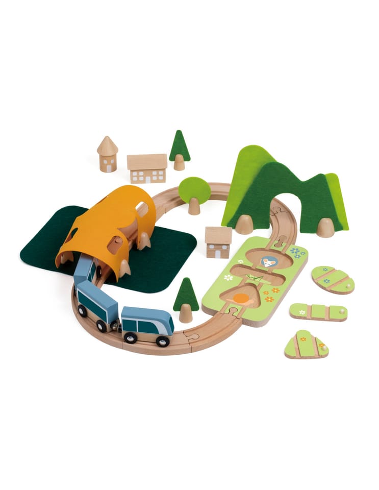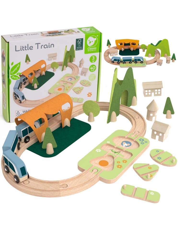 Zestaw kolejka drewniana pociąg od marki CLASSIC WORLD to prawdziwa piękność, a jego atrakcje i filcowe dekoracje pełne są niespodzianek! W zestawie znajdują się tunel, stacja i puzzle z kształtami, które można połączyć, aby odbudować trasę. Kolorowe kwiaty i ukryte zwierzęta pomagają w znalezieniu odpowiednich kształtów. Bloki można układać w stosy, tworząc domy, które można ustawić wokół toru. Pociąg ten stymuluje kreatywność, rozwój języka, małą motorykę i koordynację. Drewno posiada certyfikat FSC, a filc wykonany jest z materiału P.E.T. pochodzącego z recyklingu.