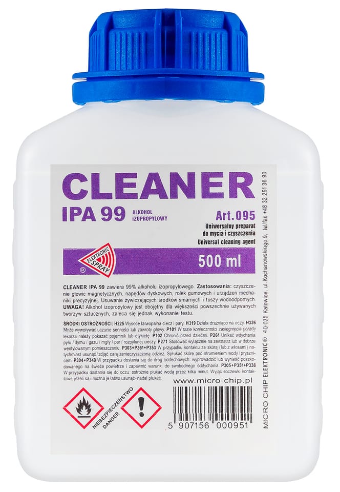 Cleaner IPA 99 to najwyższej czystości alkohol izopropylowy służący do czyszczenia m.in. płytek drukowanych. Jest najbardziej wszechstronnym i najczęściej używanym środkiem czyszczącym. Neutralny chemicznie wobec większości materiałów powszechnie stosowanych w elektronice, elektrotechnice, optyce, przemyśle precyzyjnym. Nie pozostawia śladów, szybko odparowuje. Preparat sprawdza się też doskonale w wanienkach i myjkach ultradźwiękowych. Jedynie nasz produkt nie powoduje oszronienia czyszczonych elementów.