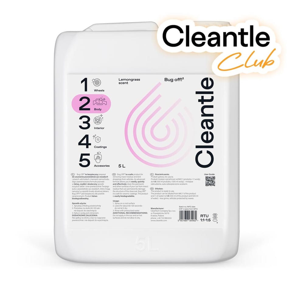 Cleantle Bug Off!² – to bezpieczny preparat do usuwania pozostałości po owadach i ptasich odchodach z karoserii samochodu. Jego zaawansowana formuła pozwala w łatwy, szybki i skuteczny sposób oczyścić lakier i inne powierzchnie Twojego auta z pozostałości po owadach, które w trwały sposób mogą naruszyć strukturę lakieru.