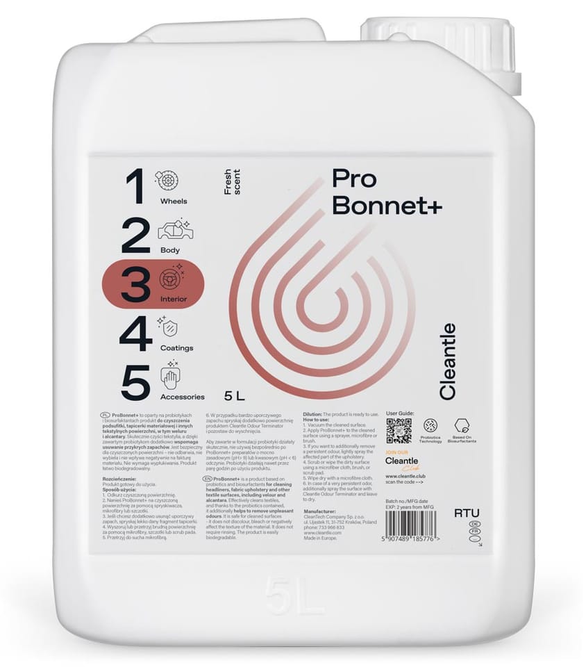 Pro Bonnet+ to środek 2 w 1 przeznaczony do czyszczenia tapicerki, podsufitki oraz innych powierzchni tekstylnych wewnątrz pojazdu. Usuwa typowe zabrudzenia eksploatacyjne, jednocześnie wspierając neutralizację nieprzyjemnych zapachów dzięki zastosowaniu probiotyków.