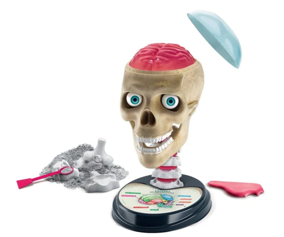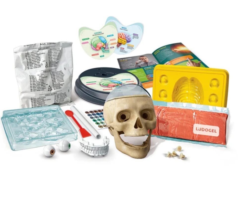 Jeden z najpopularniejszych tematów naukowych zaproponowany w zabawny i zróżnicowany sposób!Model ludzkiej czaszki do złożenia z różnymi komponentami: galaretowaty mózg do stworzenia, oczy, które faktycznie się obracają, plastikowe zęby i gipsowe kręgi!Odświeżone podejście do naukiNowe materiały do eksperymentówZabawne i edukacyjne jednocześnieWiek dziecka 8+ lat