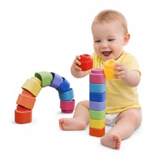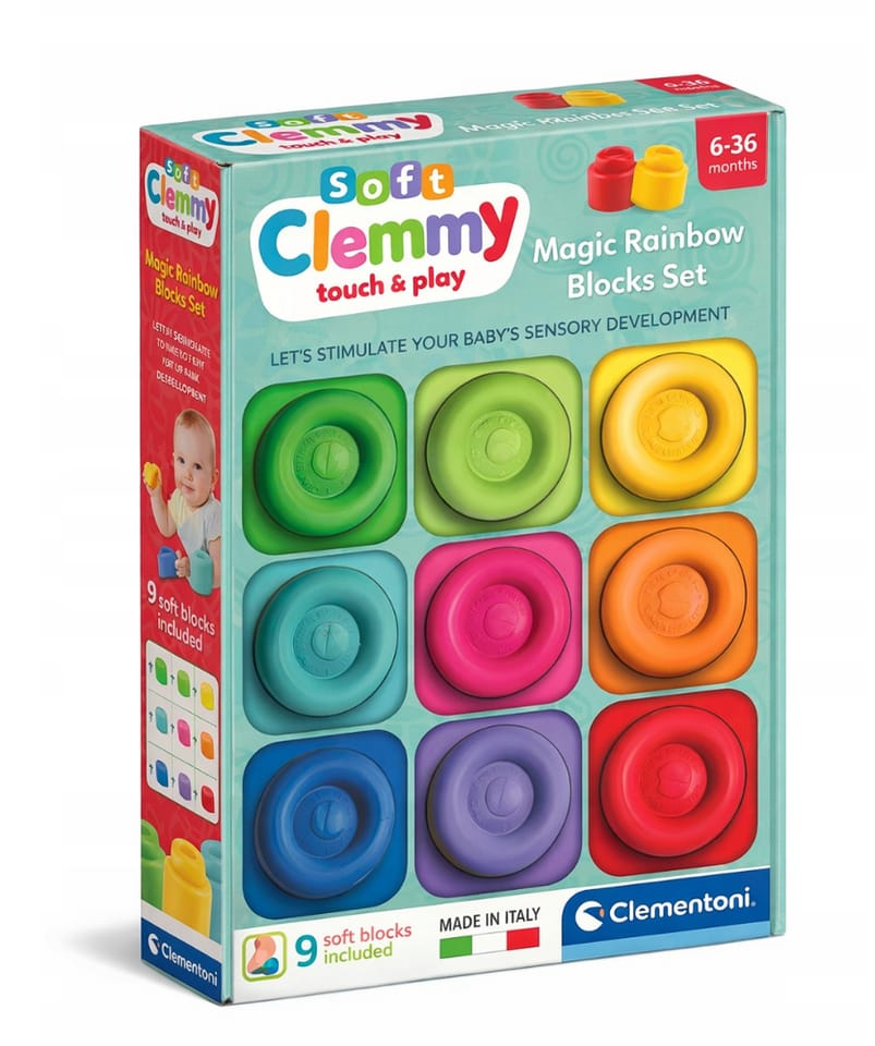 Kolorowy zestaw 9 klocków w kolorach tęczy, zapakowany w opakowanie try-me, które podkreśla miękkość materiału i bogatą paletę barw.