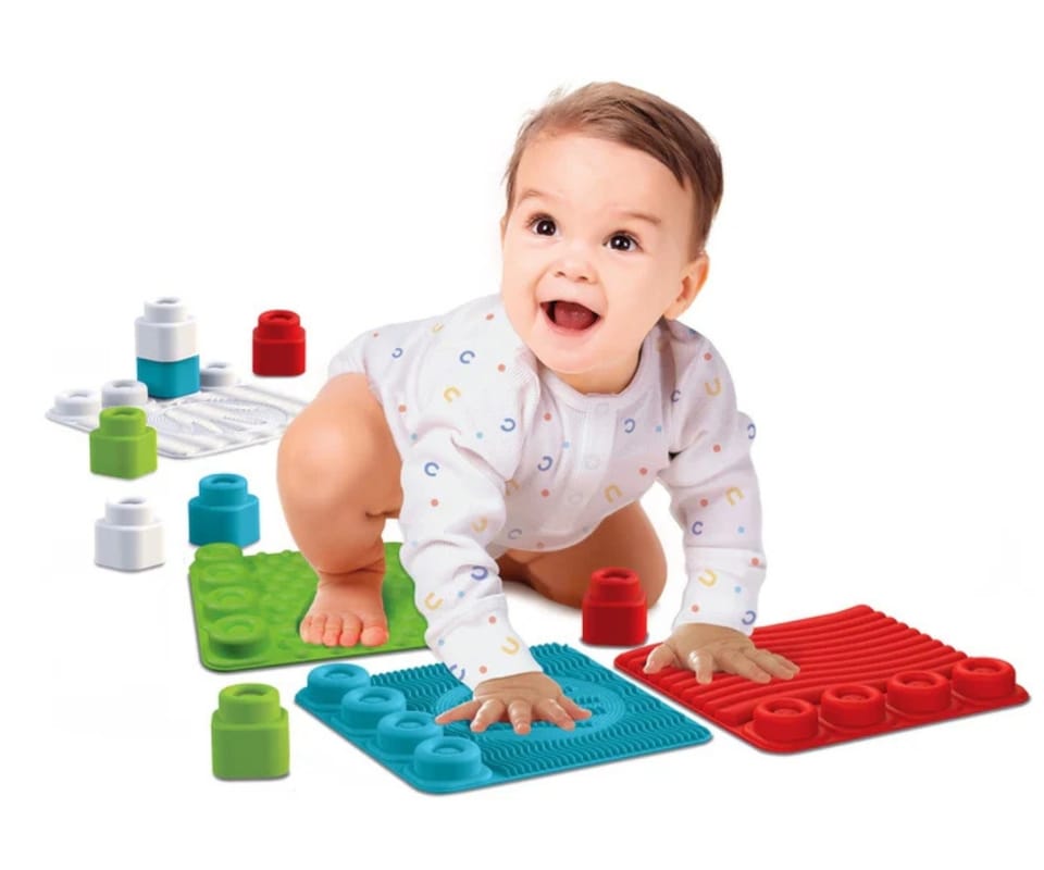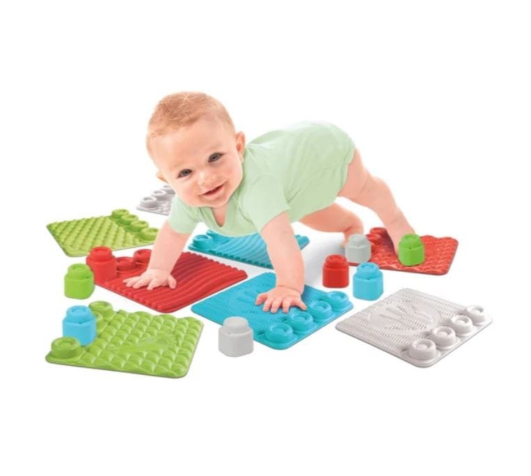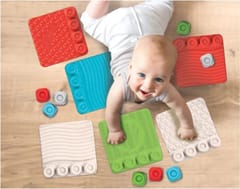 Elementy mają różnorodne chropowate tekstury, które stymulują percepcję dotykową dziecka.