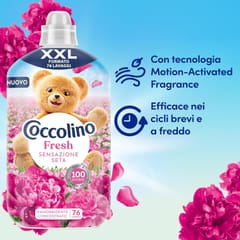 Formuła Coccolino Sensazione Seta dba o włókna tkanin, zmiękcza je i chroni przed elektryzowaniem. Dzięki temu ubrania pozostają miękkie, przyjemne w dotyku i łatwe do prasowania. Produkt jest idealny do codziennego stosowania dla całej rodziny, nadając praniu subtelną luksusową świeżość.