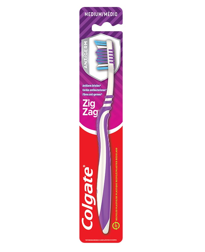 Uzyskaj doskonałą ochronę przed zarazkami dzięki szczoteczce antybakteryjnej Colgate ZigZag. Ta szczoteczka do zębów jest wyposażona w antybakteryjne włosie zasilane technologią jonów srebra, które zapobiegają gromadzeniu się bakterii na włosiu. Krzyżowe włosie ZigZag Multi Angle pomaga usunąć płytkę nazębną między zębami. Miękki środek do czyszczenia języka przymocowany do główki szczoteczki do zębów delikatnie usuwa nieprzyjemny zapach, powodując, że zarazki odświeżają oddech.