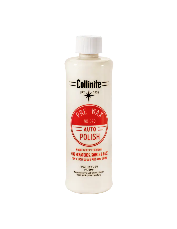 Collinite #390 Pre-wax Auto Polish - zupełnie nowy, lekko-ścierny cleaner który eliminuje niewielkie niedoskonałości lakieru takie jak drobne zarysowania, swirle, ślady po twardej wodzie, lekkie utlenienia, ryski po myciu itp. Cleaner #390 oferuje świetne wykończenie powierzchni na wysoki połysk i nadaje lakierowi wyraźną gładkość.
