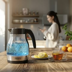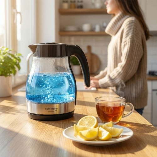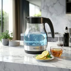 Duży, elektryczny czajnik rodzinny, pozwalający sprawnie zagotować wodę na herbatę dla 6-7 osób dzięki mocy 2200W. Zaopatrzony w wyraźny wskaźnik poziomu wody, wyłączy się automatycznie po jej zagotowaniu. Blokada uniemożliwi również włączenie pustego czajnika, oszczędzając w ten sposób energię i dbając o bezpieczeństwo użytkownika. Filtr osadów zapewni natomiast odpowiednią jakość wody. Dla wygody został zaopatrzony w obrotową podstawę, płaskie dno oraz grzałkę za stali szlachetnej i lampkę informująca o zagotowaniu wody. Szklany i elegancki pozwala zagotować na raz 1,7l wody.