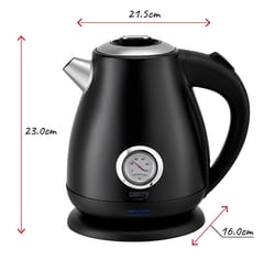 Klasyczny, 1,7-litrowy czajnik elektryczny z termometrem, przydatny w każdej kuchni. Jego bezpieczeństwo zapewnia blokada uniemożliwiająca włączenie pustego czajnika, oraz automatyczne wyłączenie po zagotowaniu wody. Funkcjonalność zwiększa stabilna podstawa i czytelny wskaźnik poziomu wody. Dysponuje mocą maksymalną 2200W i wykonany jest ze stali szlachetnej, co czyni go mistrzowskim rozwiązaniem, jeśli chodzi o szybkie gotowanie wody. Analogowy wskaźnik temperatury wody i smukły kształt to cechy, dzięki którym uzupełnisz wystrój pomieszczenia urządzonego w każdym stylu.
